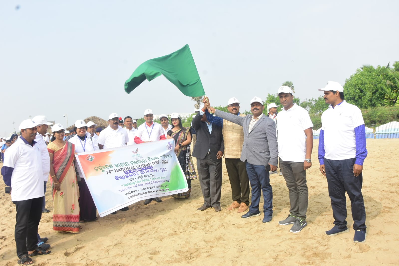 ଜାତୀୟ ମତଦାତା ଦିବସ ଅବସରରେ ପୁରୀ ବ୍ଲୁ ଫ୍ଲାଗ ବିଚରେ ସଚେତନତା ଶୋଭାଯାତ୍ରାକୁ ଶୁଭାରମ୍ଭ କରୁଛନ୍ତି ଅତିରିକ୍ତ ଜିଲ୍ଲାପାଳ।