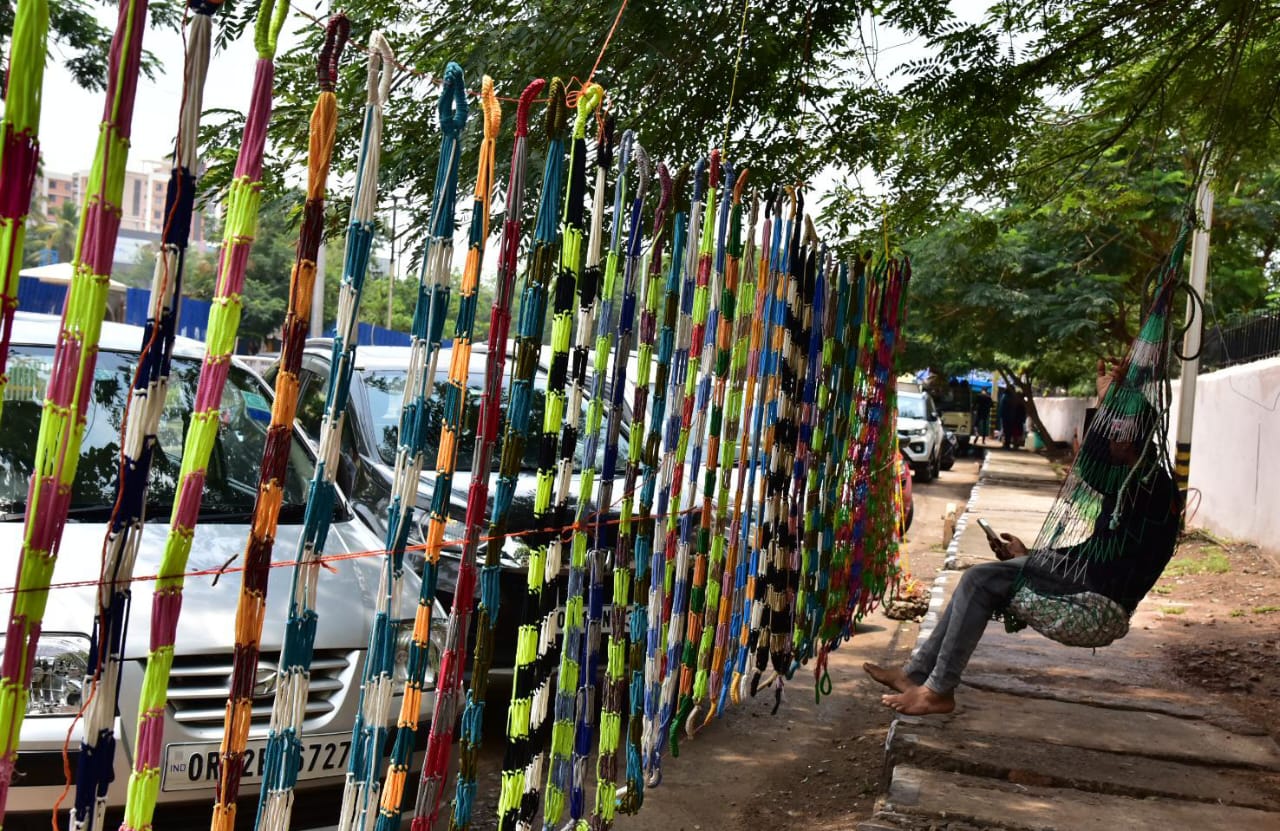 ରଜ ପର୍ବ ପୂର୍ବରୁ ପ୍ଲାଷ୍ଟିକ୍ ଦଉଡିରେ ନିର୍ମିତ ଦୋଳି ସୋମବାର ବିଜେଡି କଲେଜ ରୋଡ୍ ନିକଟରେ ଜଣେ ବ୍ୟବସାୟୀ ବିକ୍ରୟ ପାଇଁ ରଖିଛନ୍ତି