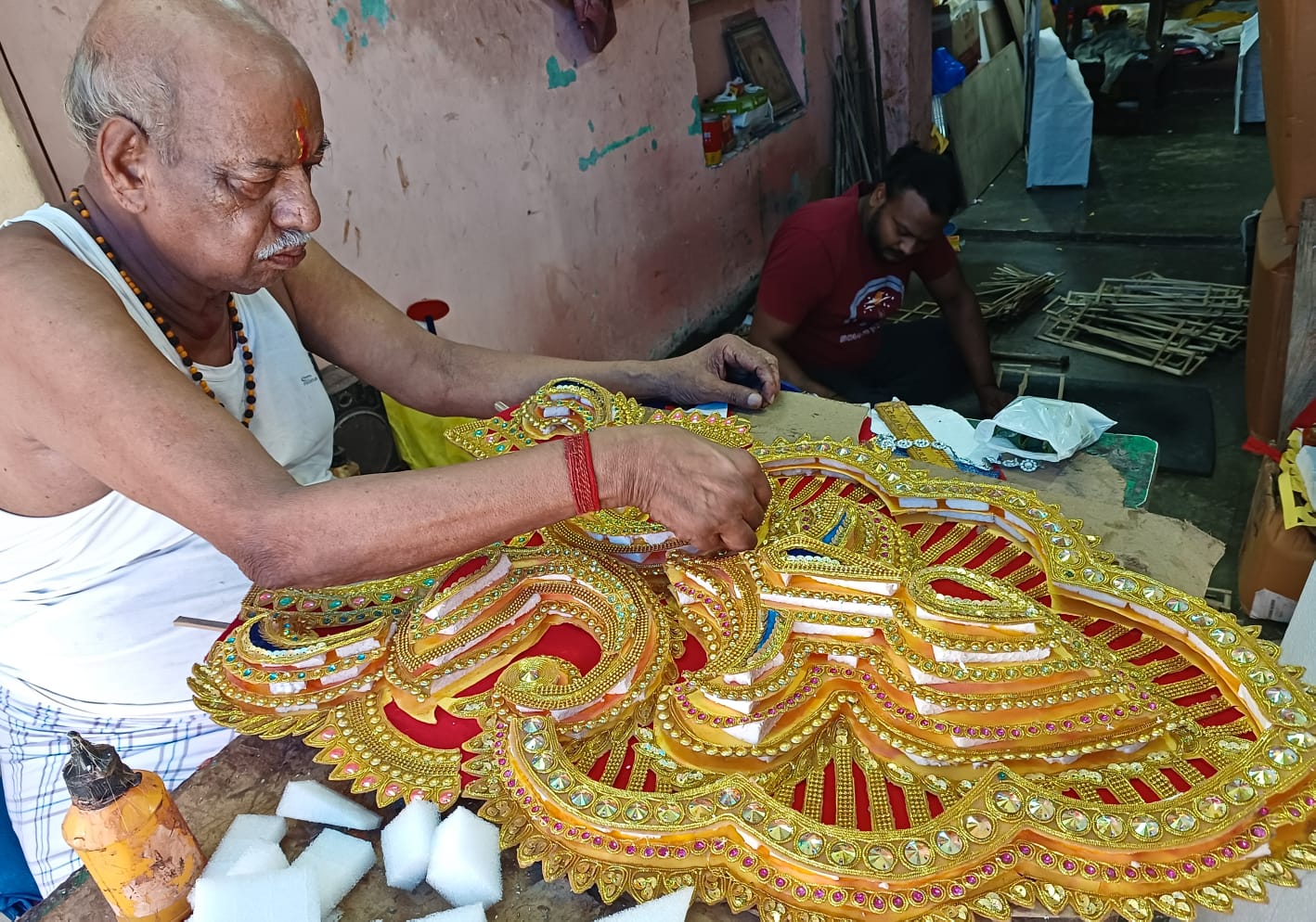 କଟକ ଫିରିଙ୍ଗ ବଜାର ଅଂଚଳରେ ଜଣେ କାରିଗର ଜରୀରେ ମୁକୁଟ ପ୍ରସ୍ତୁତ କରୁଛନ୍ତି