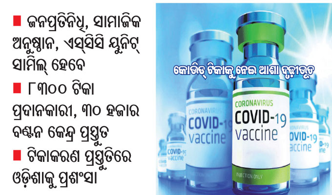 ସ୍ବାସ୍ଥ୍ୟ ଓ ପରିବାର କଲ୍ୟାଣ ବିଭାଗ ଅତିରିକ୍ତ ମୁଖ୍ୟ ଶାସନ ସଚିବ ପ୍ରଦୀପ୍ତ କୁମାର ମହାପାତ୍ର କହିଛନ୍ତି, ମୁଖ୍ୟ ଶାସନ ସଚିବଙ୍କ ଅଧ୍ୟକ୍ଷତାରେ ଗଠିତ ରାଜ୍ୟ ଷ୍ଟିଅରିଂ କମିଟି ଓ ଅତିରିକ୍ତ ମୁଖ୍ୟ ଶାସନ ସଚିବଙ୍କ ଅଧ୍ୟକ୍ଷତାରେ ଗଠିତ ରାଜ୍ୟ ଟାସ୍କଫୋର୍ସ କମିଟି ବୈଠକ ଅନୁଷ୍ଠିତ ହୋଇ ଟିକାକରଣ କାର୍ଯ୍ୟପଦ୍ଧତି ନିର୍ଦ୍ଧାରଣ କରାଯାଇଛି। ଜିଲାପାଳଙ୍କ ଅଧ୍ୟକ୍ଷତାରେ ଜିଲାସ୍ତରୀୟ ଓ ବିଡିଓଙ୍କ ଅଧ୍ୟକ୍ଷତାରେ ବ୍ଲକ୍ ଟାସ୍କଫୋର୍ସ କମିଟି ଗଠନ କରାଯାଇଛି। ୮୩୦୦ ଟିକା ପ୍ରଦାନକାରୀ ଓ ୩୦ ହଜାର ବିତରଣ କେନ୍ଦ୍ର ନିର୍ଦ୍ଧାରଣ କରାଯାଇଛି। କୋଲ୍ଡଚେନ୍, ଫ୍ରିଜର, ଟିକା ସଂରକ୍ଷଣ ସ୍ଥାନ ଆଦିର ତାଲିକା ସରିଛି। ଆବଶ୍ୟକତା ଅନୁସାରେ ଅଧିକ କୁଲର, ଫ୍ରିଜର ଆଦିର ସଂଗ୍ରହ ନିମନ୍ତେ ବ୍ୟବସ୍ଥା କରାଯାଇଛି। ଟିକାକରଣ ପରେ ସମ୍ଭାବ୍ୟ ଭେଷଜ ପ୍ରତିକ୍ରିୟାର ଉପଯୁକ୍ତ ଚିକିତ୍ସା ନିମନ୍ତେ ମଧ୍ୟ ବ୍ୟବସ୍ଥା କରାଯାଉଛି ବୋଲି ମହାପାତ୍ର ସୂଚନା ଦେଇଛନ୍ତି।