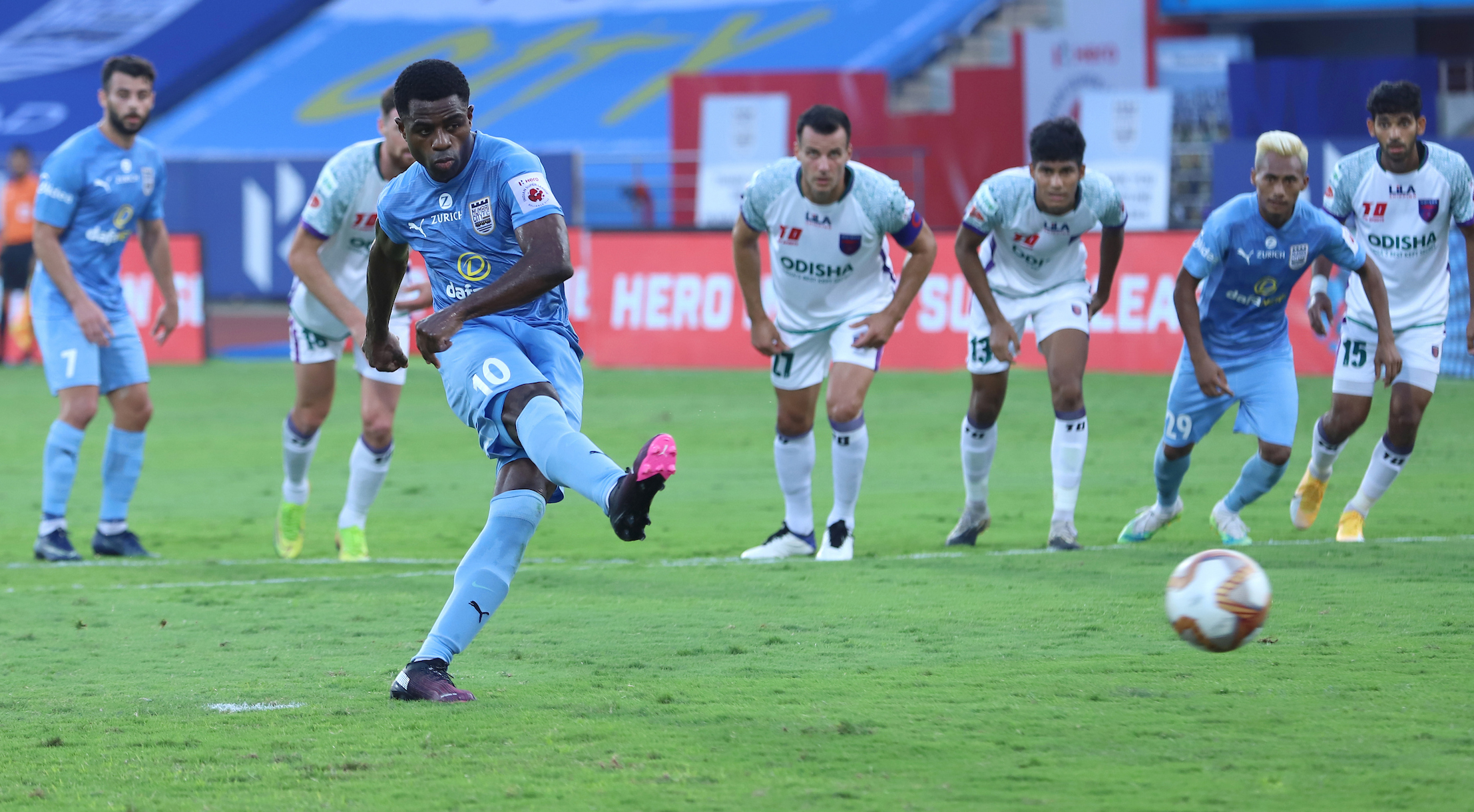 Bartholomew Ogbeche of Mumbai City FC takes the penalty during match 18 of the 7th season of the Hero Indian Super League between Mumbai City FC and Odisha FC held at the GMC Stadium Bambolim, Goa, India on the 6th December 2020 Photo by Deepak Malik / Sportzpics for ISL