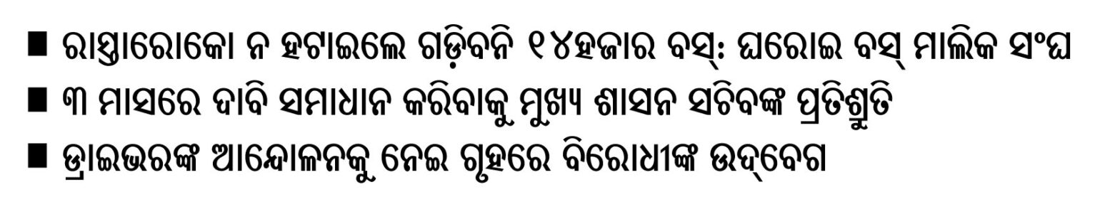 ବସ୍ ଚଳାଚଳ ବନ୍ଦ ଯୋଗୁ ସବୁ ବର୍ଗର ଲୋକମାନେ ଅସୁବିଧା ଭୋଗିଲେଣି। ବିଶେଷ କରି ସ୍କୁଲ, କଲେଜରେ ପରୀକ୍ଷା ଚାଲିଥିବାରୁ ଶିକ୍ଷୟିତ୍ରୀଶିକ୍ଷକଙ୍କ ଠାରୁ ଆରମ୍ଭ କରି ପିଲାମାନେ ଯିବା ଆସିବାରେ ଅସୁବିଧାର ସମ୍ମୁଖୀନ ହେଉଛନ୍ତି। ଡ୍ରାଇଭର ଆନ୍ଦୋଳନ ଯୋଗୁ ରାଜ୍ୟବାସୀ ଦୁର୍ଦ୍ଦଶା ଭୋଗ କରୁଛନ୍ତି। ବିଭିନ୍ନ ଜିଲାରେ ଡ୍ରାଇଭରମାନେ ଆନ୍ଦୋଳନକୁ ଜୋରଦାର କରିଥିବାରୁ କିଛି ସ୍ଥାନରେ ପୋଲିସ ସହ ଡ୍ରାଇଭରମାନଙ୍କ ଧସ୍ତାଧସ୍ତି ପରିସ୍ଥିତି ଦେଖିବାକୁ ମିଳିଛି। ସେପଟେ ଡ୍ରାଇଭର ଆନ୍ଦୋଳନକୁ ନେଇ ବିଧାନସଭା ହୁଲ୍ସ୍ଥୂଲ୍ ହୋଇଛି। ଡ୍ରାଇଭରମାନଙ୍କ ସହ ଆଲୋଚନା କରି ସେମାନଙ୍କ ସମସ୍ୟା ଦୂର କରିବାକୁ ବିରୋଧୀ ଭାଜପା ଓ କଂଗ୍ରେସ ସଦସ୍ୟମାନେ ଦାବି କରିଛନ୍ତି। ଗୁରୁବାର ବିଧାନସଭା ଶୂନ୍ୟକାଳରେ ବିରୋଧୀ ଦଳ ନେତା ଜୟନାରାୟଣ ମିଶ୍ର ଏହି ପ୍ରସଙ୍ଗ ଉଠାଇ କହିଥିଲେ, ଡ୍ରାଇଭରମାନେ ରାତି ତମାମ ଗାଡ଼ି ଚଳାଉଛନ୍ତି। ସେମାନେ ବିଭିନ୍ନ ଦାବି ନେଇ ଆନ୍ଦୋଳନ ଚଳାଇଛନ୍ତି। ଡ୍ରାଇଭରଙ୍କ ସହ ସରକାର କାହିଁକି ଆଲୋଚନା କରୁନାହାନ୍ତି। ସେହିପରି ପ୍ରଶ୍ନୋତ୍ତର କାର୍ଯ୍ୟକ୍ରମ ଶେଷ ହେବା ମାତ୍ରେ ଶୂନ୍ୟକାଳରେ ନରସିଂହ ମିଶ୍ର ଏହି ପ୍ରସଙ୍ଗ ଉଠାଇ କହିଥିଲେ ଯେ ଡ୍ରାଇଭରମାନେ ଆନ୍ଦୋଳନ ଚଳାଇଛନ୍ତି। ରାଜ୍ୟରେ ବସ୍ ସେବା ସମ୍ପୂର୍ଣ୍ଣ ଠପ୍ ହୋଇ ଯାଇଛି। ଟ୍ରକ୍, ୩ଚକିଆ ଯାନ ଚଳାଚଳ ବନ୍ଦ ରହିଛି। ଡ୍ରାଇଭରଙ୍କ ଷ୍ଟ୍ରାଇକ୍ ଭଣ୍ଡୁର କରିବାକୁ ଅନ୍ୟ ଗୋଷ୍ଠୀଙ୍କୁ ତାଙ୍କ ବିରୋଧରେ ଲଗାଇ ଦିଆଯାଇଛି। ଯେଉଁ ସମସ୍ୟା ନେଇ ଗୃହରେ ଆଲୋଚନା ହେଉଛି ତାହା ଉପରେ ସରକାର କିଛି ପଦକ୍ଷେପ ନେଉନାହାନ୍ତି। ଏ ଗୃହ ବିଭିନ୍ନ ଶ୍ରେଣୀର ଲୋକଙ୍କୁ ନ୍ୟାୟ ଦେଇପାରୁ ନାହିଁ। ସରକାର ବାଧ୍ୟ କରୁଛନ୍ତି ଗୃହର ମଧ୍ୟଭାଗକୁ ଆସି ଗଣ୍ଡଗୋଳ କରିବାକୁ। ବିନା ହଟ୍ଟଗୋଳରେ କୌଣସି ଦାବି ସରକାରଙ୍କ ଦୃଷ୍ଟିକୁ ଆସୁ ନାହିଁ। ଏତିକି କହିବା ମାତ୍ରେ କଂଗ୍ରେସ ଦଳ ସଦସ୍ୟମାନେ ଗୃହର ମଧ୍ୟଭାଗକୁ ଆସି ହୋହଲ୍ଲା କରିଥିଲେ। ବିରୋଧୀ ଦଳ ନେତା ଜୟ ନାରାୟଣ ମିଶ୍ର ମଧ୍ୟ ଡ୍ରାଇଭର ଆନ୍ଦୋଳନକୁ ନେଇ ଉଦ୍ବେଗ ପ୍ରକାଶ କରିବା ସହ ବିଭାଗୀୟ ମନ୍ତ୍ରୀ ସେମାନଙ୍କୁ ଡାକି ଆଲୋଚନା କରନ୍ତୁ ବୋଲି ଦାବି କରିଥିଲେ। ଭାଜପା ସଦସ୍ୟମାନେ ମଧ୍ୟ କଂଗ୍ରେସ ସହ ମିଶି ଗୃହରେ ହୋହଲ୍ଲା କରିଥିଲେ। ଡ୍ରାଇଭରଙ୍କ ଦାବି ତୁରନ୍ତ ପୂରଣ କରିବାକୁ ଦାବି କରିଥିଲେ। ଗୃହରେ ସ୍ବାଭାବିକ ଅବସ୍ଥା ଫେରାଇ ଆଣିବା ପାଇଁ ବାଚସ୍ପତି ସର୍ବଦଳୀୟ ବୈଠକ ଡାକିବା ସହ ଗୃହକୁ ୧୦ ମିନିଟ ପାଇଁ ମୁଲତବୀ ଘୋଷଣା କରିଥିଲେ। ପ୍ରାୟ ଅଧଘଣ୍ଟା ଆଲୋଚନା ପରେ ୧୨ଟା ୩୮ରେ ଗୃହ କାର୍ଯ୍ୟ ଆରମ୍ଭ ହୋଇଥିଲା। ବାଚସ୍ପତି କହିଥିଲେ, ବିରୋଧୀ ଦଳ ସଦସ୍ୟମାନେ ଡ୍ରାଇଭରଙ୍କ ସହ ଆଲୋଚନା କରିବାକୁ ଦାବି କରିଛନ୍ତି। ପରିବହନ ମନ୍ତ୍ରୀ ଡ୍ରାଇଭରମାନଙ୍କ ସହ ଆଲେଚାନ କରି ଶୁକ୍ରବାର ଗୃହରେ ଏକ ବିବୃତି ଦେବାକୁ ବାଚସ୍ପତି ରୁଲିଂ ଦେଇଛନ୍ତି।