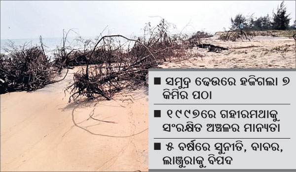 କେନ୍ଦ୍ରାପଡ଼ା ଅଫିସ, ୧୪ା୯: ପ୍ରକୃତିର ବିସ୍ମୟ ବିରଳ ଅଲିଭରିଡ୍ଲେ କଇଁଛଙ୍କ ଅନ୍ତୁଡ଼ିଶାଳ ଭାବେ ପରିଚିତ କେନ୍ଦ୍ରାପଡ଼ା ଜିଲା ବିଶ୍ୱପ୍ରସିଦ୍ଧ ଗହୀରମଥା ସାମୁଦ୍ରିକ ସଂରକ୍ଷିତ ଅଞ୍ଚଳ ପ୍ରତି ବିପଦ ବଢ଼ୁଛି। ଗତ ୫ ଦଶନ୍ଧି ପୂର୍ବେ ଅଗରନାଶୀ ଦ୍ୱୀପର ଲମ୍ବ ୭ କିମି ପର୍ଯ୍ୟନ୍ତ ପରିବ୍ୟାପ୍ତ ଥିଲା। ତଟକ୍ଷୟ ଯୋଗୁ ଇତିମଧ୍ୟରେ ସମୁଦ୍ରରେ ନିଶ୍ଚିହ୍ନ ହୋଇଯାଇଛି। ଏପରି ତଟକ୍ଷୟକୁ ଦେଖିଲେ ଆଗାମୀ ୫ ବର୍ଷ ମଧ୍ୟରେ ଆଇସିୟୁଏନ୍ ରେଡ୍ ଡାଟା ଲିଷ୍ଟରେ ଥିବା ଅଲିଭରିଡ୍ଲେଙ୍କ ପ୍ରଜନନ ସ୍ଥଳ (ଅନ୍ତୁଡ଼ିଶାଳ), ୧୦ହଜାରରୁ ଊର୍ଦ୍ଧ୍ୱ ରହୁଥିବା ପକ୍ଷୀଙ୍କ ବାସସ୍ଥଳ ଚଟକା ସମେତ ମହାକାଳପଡ଼ା ବ୍ଲକର ସୁନୀତି, ବାବର ଓ ଲାଞ୍ଜୁରା ପଞ୍ଚାୟତରେ ସମୁଦ୍ର ପାଣି ଦେଖିବାକୁ ମିଳିବ ବୋଲି ପରିବେଶବିତ୍ମାନେ ଆକଳନ କରିଛନ୍ତି।