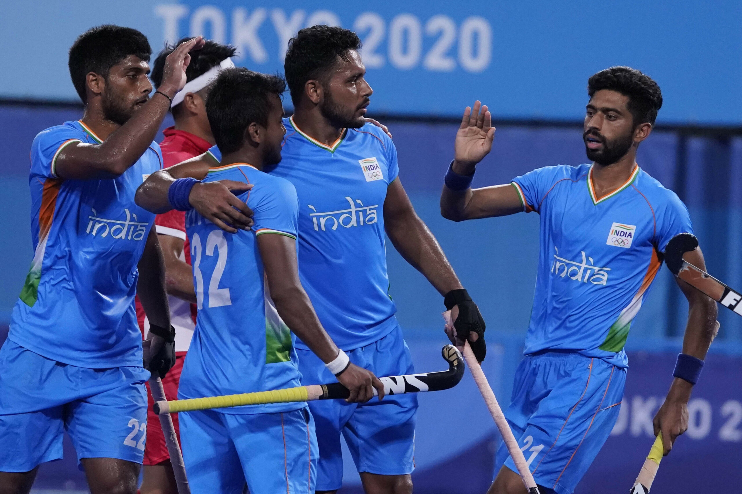 Tokyo: Players celebrate after India's Harmanpreet Singh, second from right, scored against Japan during a men's field hockey match at the 2020 Summer Olympics, Friday, July 30, 2021, in Tokyo, Japan. AP/PTI(AP07_30_2021_000199B)