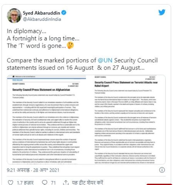 ସୂଚନାଯୋଗ୍ୟ, ମିଳିତ ଜାତିସଂଘରେ ଭାରତର ପୂର୍ବତନ ସ୍ଥାୟୀ ପ୍ରତିନିଧି ସୟଦ ଆକବର ଉଦ୍ଦିନ ଏହି ପରିବର୍ତ୍ତନ ବିଷୟରେ ପ୍ରଥମେ ଉଲ୍ଲେଖ କରିଥିଲେ। ୟୁଏନଏସସି ବିବୃତ୍ତିର ପୂର୍ବ କପିର ବିବୃତିରେ ଥିବା ଶବ୍ଦକୁ ମାତ୍ର ୧୫ ଦିନ ମଧ୍ୟରେ ହଟାଇ ଦିଆଯାଇଛି। ତେବେ ୟୁଏନଏସସି ସୂତ୍ରରୁ ପ୍ରକାଶ ଯେ ବାସ୍ତବତାକୁ ଦୃଷ୍ଟିରେ ରଖି ଏହି ନିଷ୍ପତ୍ତି ନିଆଯାଇଛି। ବର୍ତ୍ତମାନ ତାଲିବାନ ଆଫଗାନିସ୍ତାନରୁ ବିଦେଶୀମାନଙ୍କୁ ବାହାର କରିବାରେ ସାହାଯ୍ୟ କରୁଛି। ଏଭଳି ପରିସ୍ଥିତିରେ କୂଟନୈତିକ ଦୃଷ୍ଟିକୋଣରୁ ତାଲିବାନକୁ ସିଧାସଳଖ ଟାର୍ଗେଟ କରିବା ଠିକ ହେବ ନାହିଁ ବୋଲି କୁହାଯାଉଛି।