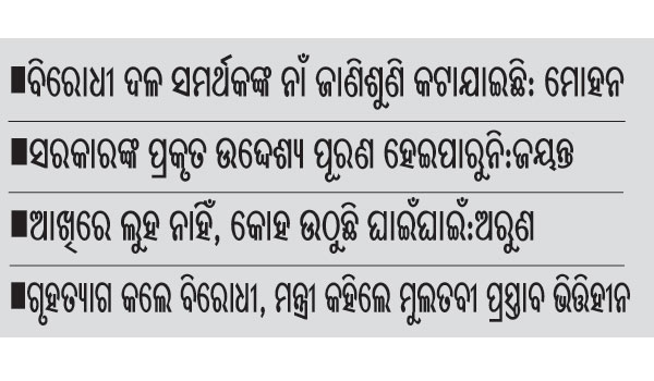 ଶାସକ ଦଳ ବିଧାୟକ ଅରୁଣ କୁମାର ସାହୁ କହିଥିଲେ ଯେ, ଓଡିଶା ଲୋକମାନଙ୍କୁ ପକ୍କାଘରଟିଏ ଯୋଗାଇ ଦେବାକୁ ଅକଥନୀୟ ନିର୍ଯ୍ୟାତନା ଦେଇଛନ୍ତି। ବିରୋଧୀ ଅଭିଯୋଗ କରୁଛନ୍ତି ଭାଜପା ଲୋକଙ୍କ ଜାଣିକି କାଟି ଦିଆଯାଉଛି, ଏହାଠାରୁ ବଳି ବଡ ମିଛ କିଛି ନାହିଁ। ପ୍ରଥମେ ସେମାନେ କୁହନ୍ତୁ ଶେଷ ୩ ବର୍ଷ କାଳ କାହିଁକି କେନ୍ଦ୍ର ସରକାର ଘର ଦେବା ବନ୍ଦ କରିଥିଲେ। ଯଦି ୩ ବର୍ଷ ତଳୁ ଆବଶ୍ୟକତା ଅନୁଯାୟୀ ଘର ଦେଇଥାଆନ୍ତେ ତେବେ ବହୁ ହିତାଧିକାରୀ କଭର ହେଇସାରନ୍ତେଣି। ଏମାନେ ହେଉଛନ୍ତି ପେଞ୍ଚୁଆ ଦଳ। କେମିତି ରାଜ୍ୟରେ ହିତାଧିକାରୀ ଘର ନ ପାଇଲେ ଏ ସରକାରଠାରୁ ମୁହଁ ଫେରାଇବେ ସେମାନେ କେମିତି ସରକାରକୁ ପଳେଇ ଆସିବେ ସେହି କଥା ଭାବୁଛନ୍ତି। ଏମାନେ ଦିଲ୍ଲୀ ଯାଇ ବସିଥିଲେ ଓଡିଶାକୁ କେମତି ଘର ନ ମିଳିବ। ଉପା ସରକାର ସମୟରେ ଏହି ଘର ବାବଦକୁ କେନ୍ଦ୍ର ୭୫% ରାଜ୍ୟ ୨୫% ଅର୍ଥ ବହନ କରୁଥିଲା। ଭାଜପା ନେତୃତ୍ୱାଧିନ ଏନ୍ଡିଏ ସରକାର ଆସିବା ପରେ ଏହି ଅନୁପାତ ୬୦:୪୦ କରିଦେଲେ। ପ୍ରସାଶନିକ ଖର୍ଚ୍ଚ ଏବଂ ଇନସେନଟିଭ ବାବଦକୁ ରାଜ୍ୟ ଯାହା ଦେଉଛି ଅଧା ଅଧା ଟଙ୍କା ଉଭୟ ସରକାର ଦେଉଛନ୍ତି। ଏଥିରେ ଏମାନେ କହିବେ ପ୍ରଧାନମନ୍ତ୍ରୀ ଆବାସ ଯୋଜନା ଲୋଗୋ ଲାଗିବ। ଏମାନଙ୍କ ଆଖିରେ ଲୁହ ନାହିଁ, କୋହ ଉଠୁଛି ଘାଇଁଘାଇଁ ବୋଲି ଅରୁଣ କହିଛନ୍ତି। ବିଜେଡି ସଦସ୍ୟ ଚନ୍ଦ୍ର ସାରଥୀ ବେହେରା ବିଗତ ଦିନରେ କଟକ ମେୟର ରାଶନକାର୍ଡ ହାତେଇ ପଦରୁ ହଟିଥିବା ଏବଂ ମୁଖ୍ୟମନ୍ତ୍ରୀଙ୍କ ଦୁର୍ନୀତି ବିରୋଧୀ ଆଭିମୁଖ୍ୟ କଥା କହିଥିଲେ। ସେହିପରି ବିଜେଡି ସଦସ୍ୟ ଉମାକାନ୍ତ ସାମନ୍ତରାୟ ମଧ୍ୟ କେନ୍ଦ୍ରକୁ ଟାର୍ଗେଟ କରିଥିଲେ। ଶେଷରେ ମନ୍ତ୍ରୀ ତାଙ୍କ ଉତ୍ତର ଦେବା ସମୟରେ ବିରୋଧୀ ଗୃହ ତ୍ୟାଗ କରିଥିଲେ। ତେଣୁ ମନ୍ତ୍ରୀ ପ୍ରଧାନମନ୍ତ୍ରୀ ଆବାସ ଯୋଜନାରେ କେନ୍ଦ୍ର କରିଥିବା ଗାଇଡ୍ଲାଇନ କଥା ଉଲ୍ଲେଖ କରିବା ସହ ମୁଲତବୀ ପ୍ରସ୍ତାବ ଭିତ୍ତିହୀନ ବୋଲି କହିଥିଲେ।