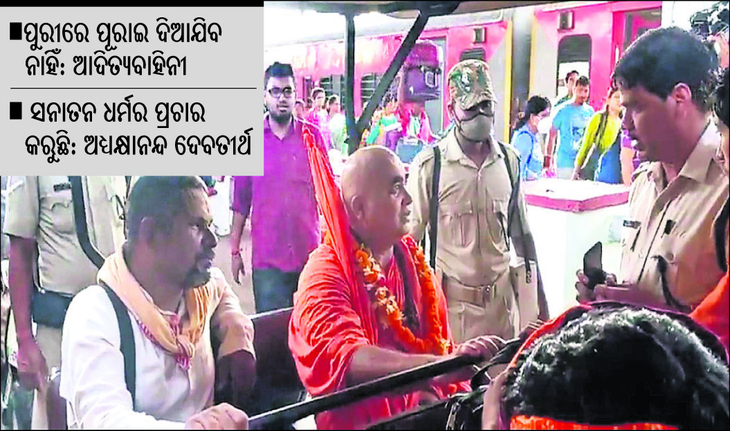 ପୁରୀ ଅଫିସ,୧୭।୫:ଆତ୍ମଘୋଷିତ ଶଙ୍କରାଚାର୍ଯ୍ୟ ଅଧ୍ୟକ୍ଷାନନ୍ଦ ଦେବତୀର୍ଥ ମହାରାଜଙ୍କୁ ପୁରୀରେ ବିରୋଧର ସମ୍ମୁଖୀନ ହେବାକୁ ପଡ଼ିଛି। ଏକ କାର୍ଯ୍ୟକ୍ରମରେ ଯୋଗଦେବାକୁ ସେ ପୁରୀ ଆସିଥିବା ବେଳେ ସୋମବାର ଆଦିତ୍ୟ ବାହିନୀ ପକ୍ଷରୁ ତାଙ୍କୁ ତୀବ୍ର ବିରୋଧ କରାଯାଇଛି। ଫଳରେ ପୁରୀ ରେଳଷ୍ଟେଶନରେ ସେ ଅଧଘଣ୍ଟା ଧରି ଅଟକି ରହିଥିଲେ। ପରେ ପୋଲିସ ପହଞ୍ଚି ତାଙ୍କୁ ସୁରକ୍ଷା ମଧ୍ୟରେ ଆଣିଥିଲା।