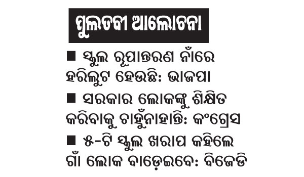 ଅନ୍ୟପକ୍ଷରେ ବିରୋଧୀ ଆଣିଥିବା ମୁଲତବୀ ପ୍ରସ୍ତାବକୁ ବିଜେଡି ସଭ୍ୟ ଅରୁଣ ସାହୁ ପ୍ରତ୍ୟାଖ୍ୟାନ କରିବା ସହ ଭାଜପା ଶାସିତ ରାଜ୍ୟର ଶିକ୍ଷା ବ୍ୟବସ୍ଥାକୁ ଦେଖିବାକୁ କହିଥିଲେ। ଉତ୍ତରପ୍ରଦେଶରେ ଗତ ମାଟ୍ରିକ ପରୀକ୍ଷାରେ ୭ ଲକ୍ଷ ୮୦ ହଜାର ପିଲା ପରୀକ୍ଷା ଦେଇନାହାନ୍ତି। ରାଜ୍ୟରେ ୫-ଟି ସ୍କୁଲ ଦରକାର ଅଛି। ବିରୋଧୀ ଦଳ ବିଧାୟକମାନେ ଲେଖିକରି ଦିଅନ୍ତୁ ତାଙ୍କ ନିର୍ବାଚନମଣ୍ଡଳୀରେ ୫-ଟି ସ୍କୁଲ ହେବ ନାହିଁ। ଅନ୍ୟ ଜାଗାରେ ୫-ଟି ସ୍କୁଲ ହେବ। ୨୦୧୪ରେ କେନ୍ଦ୍ରରେ ଭାଜପା ସରକାର ଆସିବା ପରେ ସର୍ବଶିକ୍ଷା ଅଭିଯାନରେ ଅତିରିକ୍ତ ଶ୍ରେଣୀଗୃହ ପାଇଁ ଅନୁଦାନ ବନ୍ଦକରି ଦିଆଯାଇଛି। ବିଜେଡି ସଭ୍ୟ ଦିବ୍ୟଶଙ୍କର ମିଶ୍ର ଓ ବ୍ୟୋମକେଶ ରାୟ କହିଲେ, ଗରିବ ପିଲାଙ୍କ ପାଇଁ ସ୍କୁଲ ରୂପାନ୍ତରଣ ହୋଇଛି। ସେମାନଙ୍କର ସ୍ବପ୍ନକୁ ପୂରଣ କରିବାକୁ ରୂପାନ୍ତରଣ ହୋଇଛି। ୫-ଟି ସ୍କୁଲ ଖରାପ କହିଲେ, ଗାଁ ଲୋକ ବାଡ଼େଇବେ। ସରକାରୀ ସ୍କୁଲରୁ ବହୁ ଛାତ୍ର ଆଇଏଏସ୍, ଆଇପିଏସ୍ ହୋଇଛନ୍ତି। ସ୍କୁଲ ପ୍ରତି ପିଲାମାନଙ୍କର ଆଗ୍ରହ ବଢ଼ିଛି ବୋଲି କହିଥିଲେ।