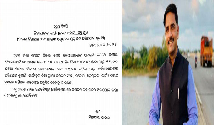 ଛତ୍ରପୁର,୧୬।୪(ଡି.ଏନ୍.ଏ.): ଗଞ୍ଜାମ ଜିଲାରେ ପୁଣି ସାଧାରଣ ଲୋକଙ୍କ ଅଭିଯୋଗ ଶୁଣାଣି ଆରମ୍ଭ ହେବ। ଏ ନେଇ ଜିଲାପାଳ ବିଜୟ ଅମୃତା କୁଲାଙ୍ଗେ ଏକ ପ୍ରେସ ବିଜ୍ଞପ୍ତି ଜରିଆରେ ଜଣାଇଛନ୍ତି। ଜିଲାରେ ପୂର୍ବରୁ ଚାଲିଥିବା ଅଭିଯୋଗ ଶୁଣାଣି ବନ୍ଦ ରହିଥିଲା । ଏହି ଅଭିଯୋଗଗୁଡ଼ିକ ଚଳିତ ଏପ୍ରିଲ ମାସ ୧୮ ତାରିଖଠାରୁ ଜିଲା ଗ୍ରାମ୍ୟ ଉନ୍ନୟନ ସଂସ୍ଥା, ଗଞ୍ଜାମ, ଛତ୍ରପୁର ଜଉଗଡ ସମ୍ମିଳନୀ କକ୍ଷରେ ସକାଳ୧୦ ଟାରୁ ୧୧ଟା ପର୍ଯ୍ୟନ୍ତ ଦିବ୍ୟାଙ୍ଗମାନଙ୍କ ଜନସମାଧାନ ଶୁଣାଣି ହେବ । ୧୧ଟାରୁ ସର୍ବସାଧାରଣ ମାନଙ୍କ ଶୁଣାଣି କାର୍ଯ୍ୟକ୍ରମ ହେବ । ଏଣୁ ଜନସାଧାରଣ ଉପରେ ଦର୍ଶିତ ଧାର୍ଯ୍ୟ ସମୟରେ ଉପସ୍ଥିତ ରହି ନିଜ ନିଜ ଅଭିଯୋଗ ଜିଲା ପ୍ରଶାସନକୁ ଜଣାଇ ପାରିବେ ।