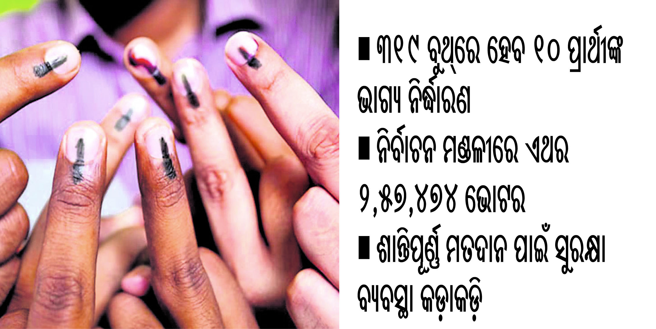 ବରଗଡ଼ ଅଫିସ୍/ପଦ୍ମପୁର,୫।୧୨(ଡି.ଏନ.ଏ):ବରଗଡ଼ ଜିଲା ପଦ୍ମପୁର ଉପନିର୍ବାଚନ ପାଇଁ ସୋମବାର ସକାଳ ୭ଟାରୁ ଅପରାହ୍ନ ୪ଟା ପର୍ଯ୍ୟନ୍ତ ମତଦାନ କରାଯିବ। ଏହାପୂର୍ବରୁ ସକାଳ ସାଢେ ୫ଟାରେ ମକ୍ ପୋଲ୍ ଆରମ୍ଭ କରାଯିବ। ପଦ୍ମପୁର ନିର୍ବାଚନ ମଣ୍ଡଳୀର ସମୁଦାୟ ୨ଲକ୍ଷ ୫୭ହଜାର ୪୭୪ ଭୋଟର ନିର୍ବାଚନୀ ମଇଦାନକୁ ଓହ୍ଲାଇଥିବା ୧୦ଜଣ ପ୍ରାର୍ଥୀଙ୍କ ଭାଗ୍ୟ ନିର୍ଦ୍ଧାରଣ କରିବେ। ଏଥିପାଇଁ ଉକ୍ତ ନିର୍ବାଚନ ମଣ୍ଡଳୀ ଅଧୀନ ପଦ୍ମପୁର ବିଜ୍ଞାପିତ ପରିଷଦ ଅଞ୍ଚଳ(ଏନ୍ଏସି)ର ୧୩ ବୁଥ୍ (ଭୋଟ୍ଗ୍ରହଣ କେନ୍ଦ୍ର) ସମେତ ୩୧୯ ବୁଥ୍ରେ ଭୋଟଗ୍ରହଣ କରାଯିବ। ତେବେ ସ୍କୁଲର ନାମ ପରିବର୍ତ୍ତନ ଯୋଗୁ ସେଥିମଧ୍ୟରୁ ୩୦୬ ବୁଥ୍ର ନାମ ପରିବର୍ତ୍ତନ ହୋଇଛି । କିନ୍ତୁ ବୁଥ୍ଗୁଡିକର ସ୍ଥାନ (ଲୋକେଶନ) ବଦଳି ନାହିଁ। କେବଳ ବୁଥ୍ ନଂ-୨୪୧, ୨୪୩ ଏବଂ ୨୯୫ର ସ୍ଥାନ ପରିବର୍ତ୍ତନ ହୋଇଥିଲେ ସୁଦ୍ଧା ତାହା ପୂର୍ବ ବୁଥ୍ ନିକଟରେ ରହିଥିବା ସୂଚନା ଦିଆଯାଇଛି। ସମୁଦାୟ ବୁଥ୍ ମଧ୍ୟରୁ ୧୫ ଆଦର୍ଶ ବୁଥ୍ ଏବଂ ୬ ପିଙ୍କ୍ ବୁଥ୍ ରହିଛି। ମତଦାନ ପାଇଁ ସୁରକ୍ଷା ବ୍ୟବସ୍ଥାକୁ କଡ଼ାକଡ଼ି କରାଯାଇଛି। ଉକ୍ତ ନିର୍ବାଚନ ମଣ୍ଡଳୀରେ ୭୯ ବୁଥ୍କୁ ଅଧୀନ ସମ୍ବେଦନଶୀଳ ବୁଥ୍ ଭାବେ ଚିହ୍ନଟ କରାଯାଇଛି। ଫଳରେ ଏହି ବୁଥ୍ ସମେତ ୧୨୦ ବୁଥ୍ରେ ୱେବ୍ କାଷ୍ଟିଂ ବ୍ୟବସ୍ଥା ହୋଇଛି। ୬୬ ବୁଥ୍ରେ ସିସିଟିଭି ସଂଲଗ୍ନ କରାଯାଇଛି। ସେହିପରି ୯୧ ମାଇକ୍ରୋ ଅବଜର୍ଭରଙ୍କୁ ନିୟୋଜିତ କରାଯାଇଛି ଏବଂ ସେମାନେ ସମସ୍ତେ କେନ୍ଦ୍ର ସରକାର ଅଧୀନରେ କାର୍ଯ୍ୟରତ କର୍ମଚାରୀ ହୋଇଥିବା ବେଳେ ସାଧାରଣ ପର୍ଯ୍ୟବେକ୍ଷଙ୍କ ତତ୍ତ୍ବାବଧାନରେ ଦାୟିତ୍ୱ ତୁଲାଉଛନ୍ତି। ମତଦାନ ସମୟରେ ଆଇନଶୃଙ୍ଖଳା ପ୍ରତି ମଧ୍ୟ ସ୍ବତନ୍ତ୍ର ଦୃଷ୍ଟି ଦିଆଯାଇଛି। ଏଥିପାଇଁ ୨୦୬ ପୋଲିସ ଅଧିକାରୀ, ୨୧ପ୍ଲାଟୁନ ଆର୍ମସ୍ ଫୋର୍ସ, ୪୪୫ ହୋମ୍ଗାର୍ଡଙ୍କ ସମେତ ସମୁଦାୟ ୧୪୧୩ ପୋଲିସ କର୍ମଚାରୀ ଏବଂ ୯ କମ୍ପାନୀ ସିଏପିଏଫ୍ ଯବାନଙ୍କୁ ନିୟୋଜିତ କରାଯାଇଛି ।
