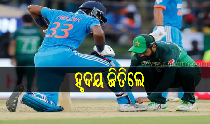 ଭାରତୀୟ ଅଧିନାୟକ ରୋହିତ ଶର୍ମା ପାକିସ୍ତାନ ବିପକ୍ଷରେ ଟସ ଜିତି ପ୍ରଥମେ ବ୍ୟାଟିଂ କରିବାକୁ ନିଷ୍ପତ୍ତି ନେଇଥିଲେ। ହାର୍ଦ୍ଦିକ ଷଷ୍ଠ ନମ୍ବରରେ ବ୍ୟାଟିଂ କରିବାକୁ ଆସିଥିଲେ। ଭାରତର ଇନିଂସ ସମୟରେ ପାଣ୍ଡ୍ୟାଙ୍କ ଜୋତା ଫିତା ଫିଟିଯାଇଥିଲା। ଏହା ଦେଖି ଶାଦବ ଖାନ ତାଙ୍କୁ ସାହାଯ୍ୟ କରିବାକୁ ଆସିଥିଲେ। ଶାଦବ ତାଙ୍କ ଜୋତା ଫିତା ବାନ୍ଧିଥିଲେ।