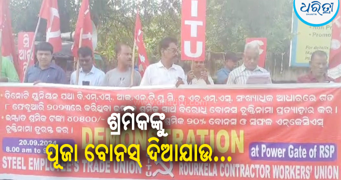 ରାଉରକେଲା,୨୦।୯(ସଙ୍ଗୀତା ଜେନା): କେନ୍ଦ୍ରୀୟ ଟ୍ରେଡ୍ ୟୁନିୟନ ସିଟୁ ସମର୍ଥିତ ଷ୍ଟିଲ୍ ଏମ୍ପ୍ଲୟିଜ୍ ଟ୍ରେଡ୍ ୟୁନିୟନ ତଥା ରାଉରକେଲା କଣ୍ଟ୍ରାକ୍ଟର ୱାର୍କର୍ସ ୟୁନିୟନ ପକ୍ଷରୁ ଶୁକ୍ରବାର ପାୱାରଗେଟ୍ ଛକଠାରେ ବିକ୍ଷୋଭ ପ୍ରଦର୍ଶନ କରାଯାଇଛି। ୨୦୨୩ ଫେବୃଆରୀ ୮ରେ ହୋଇଥିବା ଇସ୍ପାତ ଶ୍ରମିକ ସ୍ବାର୍ଥ ବିରୋଧୀ ବୋନସ ଚୁକ୍ତିନାମା ପ୍ରତ୍ୟାହାର ତଥା ଇସ୍ପାତ ଶ୍ରମିକଙ୍କୁ ଚଳିତ ପୂଜା ବୋନସ୍ ୪୦ହଜାର ୫ଶହ ଟଙ୍କାରୁ ଅଧିକ ଓ ଠିକା ଶ୍ରମିକଙ୍କୁ ୨୦ ପ୍ରତିଶତ ବୋନସ୍, ସଫଳ ଏନ୍ଜେସିଏସ୍ ଚୁକ୍ତିନାମା ଆଦି ଦାବିରେ ଉକ୍ତ ବିକ୍ଷୋଭ କରାଯାଇଥିଲା।