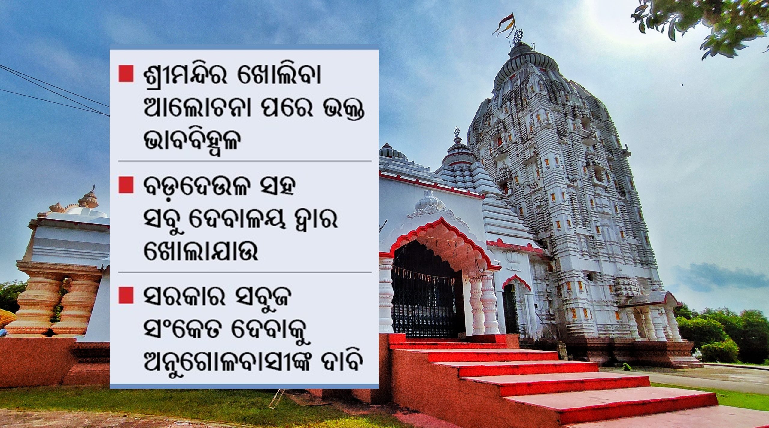 ଅନୁଗୋଳ ଜିଲାରେ ଥିବା ମନ୍ଦିରଗୁଡ଼ିକ ଖୋଲିବା ନେଇ ସରକାରଙ୍କ ନିକଟରୁ କୌଣସି ନିର୍ଦ୍ଦେଶ କି ଏସ୍ଓପି ଆସିନାହିଁ। ଶ୍ରୀମନ୍ଦିର ଖୋଲିବା ସମ୍ପର୍କରେ ବୈଠକର ନିଷ୍ପତ୍ତି ସରକାରଙ୍କ ଉପରେ ଛଡ଼ାଯାଇଛି। ଅନୁମତି ଦେବା ପରେ ଜିଲାରେ କୋଭିଡ୍ କଟକଣା ମଧ୍ୟରେ ମନ୍ଦିର ଖୋଲିବା ନେଇ ନିଷ୍ପତ୍ତି ନିଆଯିବା ସହ ପ୍ରତିଷ୍ଠିତ ମନ୍ଦିର ପରିଚାଳନା କମିଟି ସହ ଆଲୋଚନା କରାଯିବ।