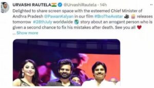 ପଓ୍ବନ କଲ୍ୟାଣ ଓ ସାଇ ଧର୍ମ ତେଜଙ୍କ ସହ ଏକ ଫଟୋ ଶେୟାର କରି ଉର୍ବଶୀ ଲେଖିଛନ୍ତି, ଆନ୍ଧ୍ର ପ୍ରଦେଶର ମୁଖ୍ୟମନ୍ତ୍ରୀ ପଓ୍ବନ କଲ୍ୟାଣଙ୍କ ସହ ଫିଲ୍ମ ବ୍ରୋ ଦ ଅବତାରରେ କାମ କରି ବହୁତ ଭଲ ଲାଗିଲା। ଫିଲ୍ମ ୨୮ ଜୁଲାଇରେ ରିଲିଜ ହେବ। ଏଥିରେ ଦେଖାଯାଇଛି କି କେମିତି ଜଣେ ଅଭିମାନୀ ମଣିଷକୁ ମୃତ୍ୟୁ ପରେ ତାଙ୍କ ଭୁଲକୁ ସୁଧାରିବାକୁ ମୌକା ଦିଆଯାଉଛି।