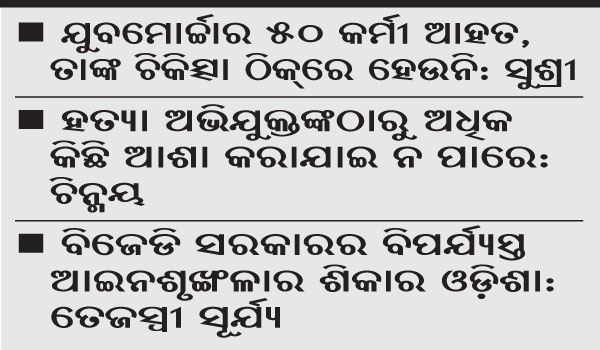 ଭାଜପା ଯୁବମୋର୍ଚ୍ଚା ରାଷ୍ଟ୍ରୀୟ ଉପାଧ୍ୟକ୍ଷା ସୁଶ୍ରୀ ଅର୍ପିତା ଅପରାଜିତା ବଡ଼ଜେନା କହିଛନ୍ତି, ମଙ୍ଗଳବାର ଶାନ୍ତିପୂର୍ଣ୍ଣ ଭାବେ ଆନ୍ଦୋଳନ କରାଯାଉଥିବା ସମୟରେ ପୋଲିସର ମାତ୍ରାଧିକ ଏବଂ ଆକ୍ରୋଶମୂଳକ ଆକ୍ରମଣରେ ଯୁବମୋର୍ଚ୍ଚାର ୫୦ରୁ ଊର୍ଦ୍ଧ୍ୱ କାର୍ଯ୍ୟକର୍ତ୍ତା ଗୁରୁତର ଆହତ ହୋଇ ଚିକିତ୍ସିତ ହେଉଛନ୍ତି। ବିକ୍ଷୋଭସ୍ଥଳରେ କାର୍ଯ୍ୟରତ ପୋଲିସଙ୍କୁ ଉଠାଇ ଆଣି ହସ୍ପିଟାଲର ଏସି ରୁମ୍ରେ ଚିକିତ୍ସା କରାଯାଉଛି। ହେଲେ ଗୁରୁତର ଭାବେ ଆହତ ହୋଇଥିବା ଯୁବମୋର୍ଚ୍ଚା କାର୍ଯ୍ୟକର୍ତ୍ତାଙ୍କୁ ଷ୍ଟ୍ରେଚରରେ ରଖାଯାଇ ଚିକିତ୍ସା କରାଯିବା ଅତ୍ୟନ୍ତ ଦୁର୍ଭାଗ୍ୟଜନକ। ସରକାରୀ ହସ୍ପିଟାଲରେ ଚିକିତ୍ସା ନ ପାଇ ବହୁ କାର୍ଯ୍ୟକର୍ତ୍ତା ଫେରିଯାଇଛନ୍ତି ବୋଲି ସୁଶ୍ରୀ କହିଛନ୍ତି।