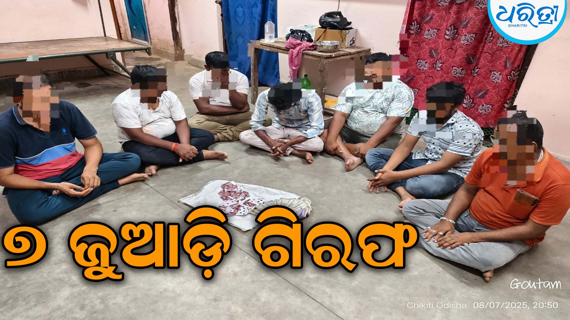 ଚିକିଟି,୮ା୮(ପ୍ରକାଶ ଚନ୍ଦ୍ର ସାହୁ): ଗଞ୍ଜାମ ଜିଲା କେ. ନୂଆଗାଁ ଥାନା ଚିକିଟି ଫାଣ୍ଡି ଅନ୍ତର୍ଗତ ଧାନଘର ଛକରେ ଗୁରୁବାର ରାତିରେ ଦୀର୍ଘଦିନ ଧରି ଚାଲିଥିବା ଜୁଆଆଡ୍ଡା ଉପରେ ଚିକିଟି ଫାଣ୍ଡି ପୋଲିସ ଚଢ଼ାଉ କରିଛି। ଏଥିରେ ୭ଜଣ ଜୁଆଡ଼ିଙ୍କୁ ଗିରଫ କରିବା ସହ ୬୧ ହଜାର ଟଙ୍କା ଗିରଫ କରାଯାଇଛି।