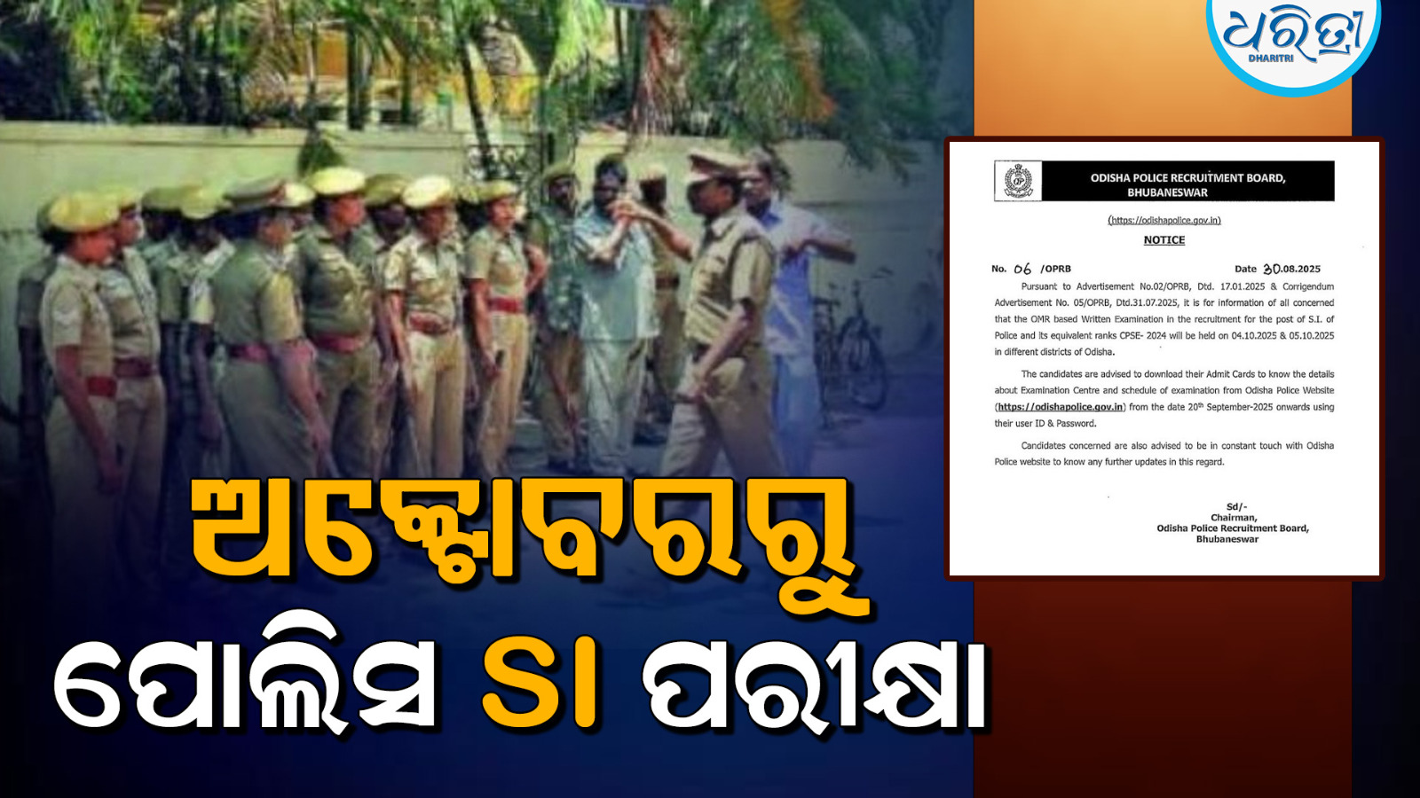 ଭୁବନେଶ୍ୱର,୩୦ା୮: ଅକ୍ଟୋବରରୁ ଆରମ୍ଭ ହେବ ପୋଲିସ SI ପରୀକ୍ଷା। OMR ସିଟ୍ ଜରିଆରେ ଲିଖିତ ପରୀକ୍ଷା ହେବ। SI ର଼୍ୟାଙ୍କର ସମସ୍ତ CPSE-୨୦୨୪ ପରୀକ୍ଷା ହେବ। ତେବେ ଅକ୍ଟୋବର ୪ ଏବଂ ୫ରେ ଏହି ପରୀକ୍ଷା ରାଜ୍ୟର ବିଭିନ୍ନ ଜିଲାରେ ଅନୁଷ୍ଠିତ ହେବ। ଓଡ଼ିଶା ପୋଲିସ ରିକ୍ରୁଟ୍ମେଣ୍ଟ ବୋର୍ଡ ପକ୍ଷରୁ ଏନେଇ ବିଜ୍ଞପ୍ତି ଜାରି ହୋଇଛି।