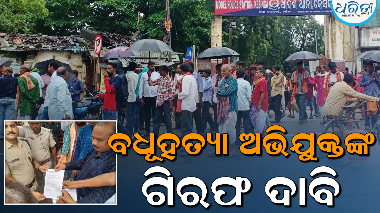 ସୂଚନାଯୋଗ୍ୟ, କଳାହାଣ୍ଡି ଜିଲା କେସିଙ୍ଗା ଥାନା ଅନ୍ତର୍ଗତ ଭମରମାଲ ଗ୍ରାମର ରୋମାଞ୍ଚଳ ସାହୁଙ୍କ ପୁତ୍ର ଜଗନ୍ନାଥ ସାହୁ ଗତ ୨୦୨୩ରେ ମ.ରାମପୁର ଥାନା ଅଧିନସ୍ଥ ବାଞ୍ଜିପଦର(ସାପଲହରା)ଗ୍ରାମର କୌତୁକ ସାହୁଙ୍କ କନ୍ୟା କ୍ଷୀରବତୀ ସାହୁଙ୍କୁ ବୈଦିକ ରୀତିନୀତି ଅନୁସାରେ ବିବାହ କରିଥିଲେ। କିଛି ମାସ ସ୍ବାମୀ ସ୍ତ୍ରୀ ଭଲରେ ଜୀବନଯାପନ କଲା ପରେ କ୍ଷୀରବତୀଙ୍କୁ ଶାଶୁ ଘରେ ବିଭିନ୍ନ ଯୌତୁକ ଦାବି ଓ ଶାରୀରିକ ନିର୍ଯାତନା ଦେଇ ଖାଇବା ପିଇବା ପାଇଁ ଖାଦ୍ୟପେୟ ନ ଦେଇ ନିର୍ଯାତନା ଦେଇ ଆସୁଥିଲେ। ଚଳିତ ମାସ ୧୦ ତାରିଖ ରାତିରେ ଜଗନ୍ନାଥଙ୍କ ପରିବାରଙ୍କ ମିଳିତ ଉଦ୍ୟମରେ କ୍ଷୀରବତୀଙ୍କୁ ମାଡ଼ମାରି ତଣ୍ଟି ଚିପି ବିଷ ପିଆଇ ଦେଇଥିବା ଝିଅର ବାପା କୌତୁକ ସାହୁ ଗ୍ରାମ ବାଞ୍ଜିପଦର (ସାପଲହରା) ଥାନା ଏମ୍.ରାମପୁରର ଗତ ୧୧.୯.୨୫ କେସିଙ୍ଗା ଥାନାରେ ଏକ ଲିଖିତ ଅଭିଯୋଗ କରିଥିଲେ। କେସିଙ୍ଗା ପୋଲିସ ସମସ୍ତ ତଦନ୍ତ ପରେ ମୃତ କ୍ଷୀରବତୀ ସାହୁଙ୍କ ସ୍ବାମୀଙ୍କୁ ଗିରଫ କରି କୋର୍ଟ ଚାଲାଣ କରି ଥିବା ଜଣାପଡ଼ିଛି। କିନ୍ତୁ ଦୁଃଖର ବିଷୟ ଏହିକ ିଯେ ଦୀର୍ଘ ୧୪ ଦିନ ବିତି ଯାଇଥିଲେ ସୁଦ୍ଧା ଫେରାର ଥିବା ଅଭିଯୁକ୍ତଙ୍କୁ ବର୍ତ୍ତମାନ ସୁଦ୍ଧା କେସିଙ୍ଗା ପୋଲିସ ଗିରଫ କରି ନ ଥିବାରୁ ଆଜି ଥାନା ଘେରାଉ କରି ଗଣଧାରଣା ଦିଆଯାଇ ଥିଲା। ଏ ନେଇ ଗତକାଲି ମଧ୍ୟ ଥାନାରେ ଲିଖିତ ଅଭିଯୋଗ କରାଯାଇଛି। ଫେରାର ଥିବା ରୋମାଞ୍ଚଳ ସାହୁ, ରୁଦେନ ସାହୁ ଓ ନେତ୍ର ସାହୁଙ୍କୁ ଗିରଫ ଦାବିରେ ଏକ ସ୍ମାରକପତ୍ର ଆଇଆଇସିଙ୍କୁ ମୃତ କ୍ଷୀରବତୀଙ୍କ ପରିବାର ଓ ସାହୁ ସମାଜ ପକ୍ଷରୁ ପ୍ରଦାନ କରାଯାଇଛି।