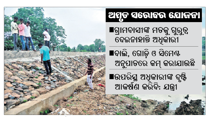 ଏମ୍ଭି ୭୯,୪ା୭(ଡି.ଏନ.ଏ.): ଗ୍ରାମାଞ୍ଚଳର ପରିବେଶକୁ ସୁନ୍ଦର ସ୍ବଚ୍ଛ କରି ପରିବେଶ ସଂରକ୍ଷଣକୁ ଦୃଷ୍ଟିରେ ରଖି ସରକାରଙ୍କ ପକ୍ଷରୁ ଅମୃତ ସରୋବର ଯୋଜନା ଆରମ୍ଭ ହୋଇଥିଲା। ଏହି ଯୋଜନାରେ ଲକ୍ଷାଧିକ ଟଙ୍କା ବ୍ୟୟରେ ଗ୍ରାମାଞ୍ଚଳରେ ନୂତନ ପୋଖରୀ ଖନନ ସହ ପୁନରୁଦ୍ଧାର କରାଯାଉଛି। ମାଲକାନଗିରି ଜିଲା କାଲିମେଳା ବ୍ଲକ ତଣ୍ଡାବାଇ ପଞ୍ଚାୟତ ଅନ୍ତର୍ଗତ ଏମଭି-୭୯ଠାରେ ଏକ ପୋଖରୀ ପୁନରୁଦ୍ଧାର କରାଯାଉଛି। ତେବେ ନିର୍ମିତ କିମ୍ବା ପୁନରୁଦ୍ଧାର ହେଉଥିବା ପୋଖରୀଗୁଡିକର କାର୍ଯ୍ୟର ମାନକୁ ନେଇ ଏବେ ପ୍ରଶ୍ନ ଉଠିଛି। ଗ୍ରାମରେ ଅମୃତ ସରୋବର ଯୋଜନାରେ ସୌନ୍ଦର୍ଯ୍ୟକରଣ କରାଯାଉଥିବା ପୋଖରୀ କାମ ଅତ୍ୟନ୍ତ ନିମ୍ନମାନର ହୋଇଥିବା ଅଭିଯୋଗ କରିଛନ୍ତି। ଠିକାଦାର ଓ ପ୍ରଶାସନିକ ଅଧିକାରୀଙ୍କ ଅବହେଳା ଯୋଗୁ ବ୍ୟୟ ହେଉଥିବା ଅର୍ଥ ପାଣିରେ ପଡିବ ବୋଲି ଗ୍ରାମର ଅଜିତ ବର୍ମନ, ବୁଲେନ କୁଣ୍ଡୁ, ପ୍ରେମ ବାରୋଇ, ସଞ୍ଜୟ କୁଣ୍ଡୁ, ମହାଦେବ ମଣ୍ଡଳ, ଗୋଲକ ରାୟ, ମହାଦେବ ବିଶ୍ବାସଙ୍କ ସମେତ ଗ୍ରାମବାସୀ କହିଛନ୍ତି। ୩୨୬ ନଂ ଜାତୀୟ ରାଜପଥ କଡରେ ଥିବା ଏହି ପୋଖରୀର ନିର୍ମାଣ କାର୍ଯ୍ୟରେ ବାଲି, ଗୋଡ଼ି ଓ ସିମେଣ୍ଟର ଅନୁପାତରେ କମ୍ କରାଯାଉଛି। ଶନିବାର କାର୍ଯ୍ୟକୁ ବିଭିନ୍ନ ଅଧିକାରୀ ବୁଲି ଦେଖିବା ବେଳେ ନିର୍ମାଣ କାର୍ଯ୍ୟ ନେଇ ସ୍ଥାନୀୟ ସରପଞ୍ଚ, ଜନପ୍ରତିନିଧି ଓ ସ୍ଥାନୀୟ ଲୋକେ ସେମାନଙ୍କ ଦୃଷ୍ଟି ଆକର୍ଷଣ କରିଥିଲେ। ନିମ୍ନମାନର କାର୍ଯ୍ୟ ହୋଇଥିବା ନେଇ ଅଭିଯୋଗ କରିଥିଲେ। ଏହା ପରେ ମଧ୍ୟ ଅଧିକାରୀମାନେ କିଛି ପଦକ୍ଷେପ ନ ନେଇ ନୀରବଦ୍ରଷ୍ଟା ସାଜିଛନ୍ତି। ଏନେଇ ସ୍ଥାନୀୟ କନିଷ୍ଠଯନ୍ତ୍ରୀ ବସନ୍ତ କୁମାର ବେହେରାଙ୍କୁ ପଚାରିବାରୁ ସେ ଏହି କାମ ନିମ୍ନମାନର ହୋଇଥିବା ସ୍ବୀକାର କରିଛନ୍ତି। ଏ ସମ୍ପର୍କରେ ଉପରିସ୍ଥ ଅଧିକାରୀଙ୍କ ଦୃଷ୍ଟି ଆକର୍ଷଣ କରି ଆବଶ୍ୟକ କାର୍ଯ୍ୟାନୁଷ୍ଠାନ ଗ୍ରହଣ କରିବେ ବୋଲି କହିଛନ୍ତି।