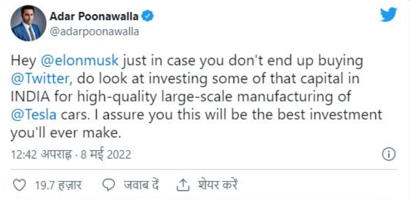 ନୂଆଦିଲ୍ଲୀ, ୮।୫ : ସେରମ ଇନଷ୍ଟିଚ୍ୟୁଟ ଅଫ ଇଣ୍ଡିଆର ସିଇଓ ଆଦର ପୁନାୱାଲା ଟୁଇଟରର ନୂତନ ମାଲିକ ଏଲୋନ ମସ୍କଙ୍କୁ ଭାରତରେ ପୁଞ୍ଜି ବିନିଯୋଗ କରିବାକୁ ପରାମର୍ଶ ଦେଇଛନ୍ତି। ସେ ଟୁଇଟ୍ କରି କହିଛନ୍ତି ଯେ ଯଦି ଆପଣ ଟୁଇଟର କିଣିବାକୁ ଚାହୁଁନାହାଁନ୍ତି, ତେବେ ସେହି ପୁଞ୍ଜିରୁ କିଛି ଅଂଶକୁ ଭାରତରେ ବିନିଯୋଗ କରିବା ସହିତ ଉଚ୍ଚମାନର ଟେସଲା କାର ନିର୍ମାଣ କରିବାକୁ ଚିନ୍ତା କରନ୍ତୁ। ପୁନାୱାଲା ଏହା ମଧ୍ୟ କହିଛନ୍ତି ଯେ ଏହା ଆପଣଙ୍କର ସର୍ବୋତ୍ତମ ନିବେଶ ହେବ।