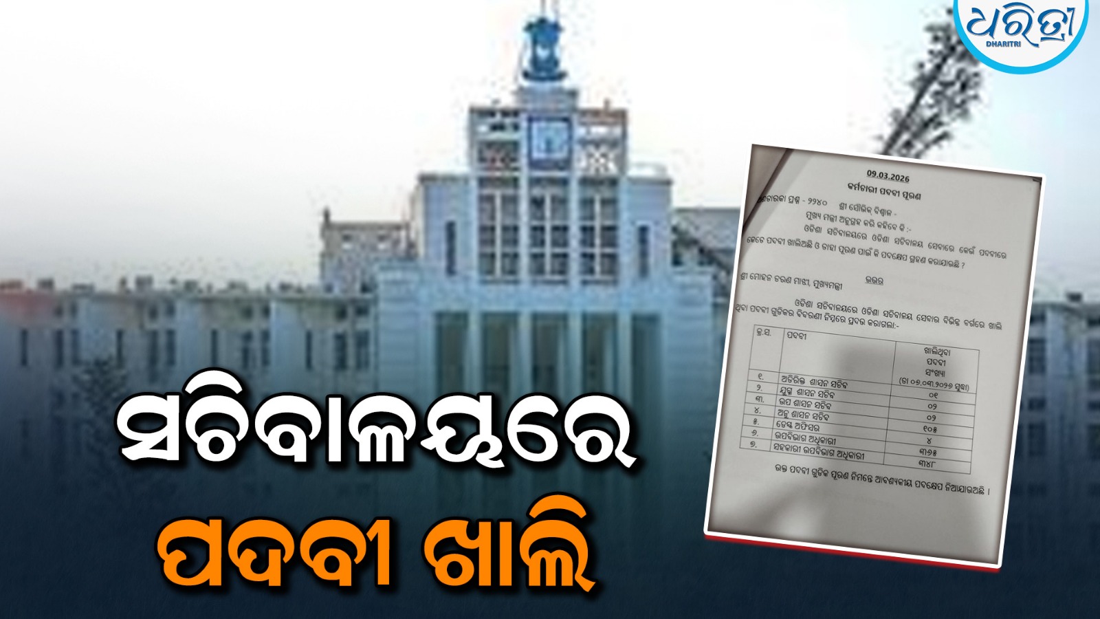 ଭୁବନେଶ୍ୱର,୯ା୩: ଓଡ଼ିଶା ସଚିବାଳୟରେ ବଡ଼ବାବୁଙ୍କ ପଦବୀ ଖାଲି ପଡ଼ିଛି। ବିଧାୟକ ସୌଭିକ ବିଶ୍ୱାଳଙ୍କ ପ୍ରଶ୍ନରେ ମୁଖ୍ୟମନ୍ତ୍ରୀ ମୋହନ ଚରଣ ମାଝୀ ଲିଖିତ ଉତ୍ତର ରଖିଛନ୍ତି।
