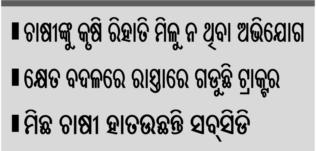 ଏ ସମ୍ପର୍କରେ କୃଷକ ନେତା ପ୍ରତ୍ୟୁଷ କୁମାର ରାଉତ କହିଛନ୍ତି, ଫାର୍ମ ମେକାନାଇଜ୍ ସ୍କିମ୍ରେ କୃଷି ସରଞ୍ଜାମ ୨୦ରୁ ୮୦ ପ୍ରତିଶତ ପର୍ଯ୍ୟନ୍ତ ଚାଷୀଙ୍କୁ ରିହାତି ମିଳୁଛି। ତେବେ ଏହି ରିହାତି ଅର୍ଥ ଚାଷୀଙ୍କ ନିକଟରେ ପହଞ୍ଚତ୍ ପାରୁନାହିଁ। କୃଷି ବିଭାଗର କେତେଜଣ ଅଧିକାରୀ, ସପ୍ଲାୟର ସବ୍ସିଡି ଅର୍ଥକୁ ହେରଫେର କରୁଥିବା ଦେଖାଯାଉଛି। ସେ କହିଛନ୍ତି, ୨୦୧୯ରେ କମ୍ବାଇନ ହାର୍ଭେଷ୍ଟର କିଣିବା ପାଇଁ କୃଷି ବିଭାଗରେ ଆବେଦନ ପତ୍ର ଦେଇଥିଲେ। କେନ୍ଦ୍ରାପଡ଼ା ଜିଲା ପାଇଁ ହାର୍ଭେଷ୍ଟର ଆଲଟମେଣ୍ଟ ହେବା ପରଦିନ ବିକ୍ରି ସରିଯାଇଥିବା ବିଭାଗୀୟ ଅଧିକାରୀଙ୍କ ସମେତ ସପ୍ଲାୟର କହିଥିଲେ। ଅଭିଯୋଗକାରୀ ଚାଷୀ ମଦନମୋହନ ସାହୁ କହିଛନ୍ତି, ସରକାର ଚାଷୀଙ୍କୁ ସବ୍ସିଡିରେ ଟ୍ରାକ୍ଟର, ପାୱାରଟିଲର, ପାଣିପମ୍ପ, ଧାନ ଓ ବାଦାମ ଝଡ଼ା ମେଶିନ ଆଦି ବିଭିନ୍ନ କୃଷି ଯନ୍ତ୍ରପାତି ତଥା ଉପକରଣ ଯୋଗାଉଛନ୍ତି। ଏଥିପାଇଁ ସହରର ଦୁହୁରିଆ, ଖଡ଼ଇଙ୍ଗ, ଗରାପୁର, ଗୋପ ଆଦି ଅଞ୍ଚଳରେ ପ୍ରାଧିକୃତ ସପ୍ଲାୟର ଅଛନ୍ତି। ତେବେ କ୍ଷେତରେ ଜଳସେଚନ ପାଇଁ ପାଣି ପମ୍ପଟିଏ ସମ୍ପୃକ୍ତ ସପ୍ଲାୟରଠାରୁ କୃଷି ବିଭାଗର ମଞ୍ଜୁରୀ ସତ୍ତ୍ୱେ ରିହାତି ଦରରେ ମିଳୁନାହିଁ। ମିଳୁଥିବା ୫୦ ପ୍ରତିଶତ ରିହାତି କାହା ଖାତାକୁ ଯାଉଛି ତାହା ତଦନ୍ତ ସାପେକ୍ଷ ବୋଲି ଅଭିଯୋଗକାରୀ ସାହୁ ପ୍ରକାଶ କରିଛନ୍ତି। ସେହିପରି ଅନ୍ୟତମ ଅଭିଯୋଗକାରୀ ଆଶିଷ କୁମାର ମହାପାତ୍ର କହିଛନ୍ତି, କେନ୍ଦ୍ରାପଡ଼ା ଜିଲାକୁ ଆସୁଥିବା ପାୱାରଟିଲର କୋଲକାତାକୁ ଚାଲାଣ ହେଉଥିବା ବହୁ ସମୟରେ ଦେଖାଯାଉଛି। ସେହିପରି କୃଷି କ୍ଷେତ୍ର ପାଇଁ ଆସିଥିବା ଟ୍ରାକ୍ଟର ଏବେ ରାସ୍ତାରେ ପରିବହନ କାର୍ଯ୍ୟରେ ଲାଗୁଛି। ମିଛ ଚାଷୀଙ୍କ ପର୍ମିଟ୍ରେ ବ୍ୟବସାୟୀମାନେ ଟ୍ରାକ୍ଟର, ପାୱାରଟିଲର ହାତଉ ଥିବାରୁ ପ୍ରଶାସନିକ ତଦନ୍ତ ହେଲେ ବହୁ ଅନିୟମିତତା ପଦାକୁ ଆସିବ ବୋଲି ସେ ପ୍ରକାଶ କରିଛନ୍ତି। ସାମାଜିକ କର୍ମୀ ପ୍ରତାପ ଚନ୍ଦ୍ର ମହାନ୍ତି କହିଛନ୍ତି, ଆଉ କିଛିଦିନ ମଧ୍ୟରେ ଖରିଫ ଚାଷ ଅମଳ ହେବ। ଚାଷ ପାଇଁ ଅଧିକ ହାର୍ଭେଷ୍ଟର ଓ ପାୱାରଟିଲର, ପାଣି ପମ୍ପ ଆବଶ୍ୟକ। ରିହାତି ଦରରେ ବିକ୍ରୟ ହେଉଥିବା କୃଷି ସାମଗ୍ରୀ ବ୍ୟବସାୟୀମାନେ କାଗଜପତ୍ରରେ ବିକ୍ରି ହେଉଥିବା ଦର୍ଶାଉଛନ୍ତି। ଏହାର ସବ୍ସିଡି ଅର୍ଥ ସପ୍ଲାୟର ହାତେଇ ନେଉଛନ୍ତି। ଏ ନେଇ ଜିଲା ପ୍ରଶାସନ ତଦନ୍ତ କରିବା ଜରୁରୀ ହୋଇପଡିଛି। ଏ ସମ୍ପର୍କରେ ଏଡିଏମ୍ ପୀତାମ୍ବର ସାମଲଙ୍କୁ ପଚାରିବାରେ ରିହାତି ଅର୍ଥରେ ବିକ୍ରୟ ହେଉଥିବା କୃଷି ସରଞ୍ଜାମରେ ଅନିୟମିତତା ହୋଇଥିବା ନେଇ ଚାଷୀମାନଙ୍କ ଅଭିଯୋଗକୁ ତଦନ୍ତ କରାଯିବ। ଏ ନେଇ ଜିଲା କୃଷି ଉପନିର୍ଦ୍ଦେଶକଙ୍କୁ ସୂଚନା ଦିଆଯାଇଛି। ବିଭାଗୀୟ ତଦନ୍ତ ପରେ ଅଭିଯୋଗର ସତ୍ୟତା ଥିଲେ କାର୍ଯ୍ୟାନୁଷ୍ଠାନ ନିଆଯିବ ବୋଲି ସେ କହିଛନ୍ତି।