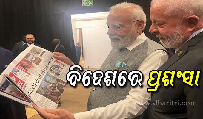 ଗୁରୁବାର ସକାଳେ ବ୍ରିକ୍ସ ସମ୍ମିଳନୀରୁ ବୈଦେଶିକ ବ୍ୟାପାର ମନ୍ତ୍ରୀ ଏସ୍.ଜୟଶଙ୍କର ଏକ ଫଟୋ ଶେୟାର କରିଛନ୍ତି। ଯେଉଁଥିରେ ପ୍ରଧାନମନ୍ତ୍ରୀ ଏକ ଖବରକାଗଜ ଧରି ବ୍ରାଜିଲର ରାଷ୍ଟ୍ରପତି ଲୁଲା ଦେ ସିଲ୍ଭାଙ୍କ ନିକଟରେ ଛିଡ଼ା ହୋଇଛନ୍ତି। ଭାରତର ଚନ୍ଦ୍ରୟାନ-୩ ମିଶନର ପ୍ରଶଂସା ଖବରକାଗଜର ପ୍ରଥମ ପୃଷ୍ଠାରେ ବୋଲ୍ଡ ଅକ୍ଷରରେ ଛପା ହୋଇଛି। ଯାହା ପ୍ରଧାନମନ୍ତ୍ରୀ ତାଙ୍କ ବ୍ରାଜିଲର ରାଷ୍ଟ୍ରପତି ଡି ସିଲଭାଙ୍କୁ ଦେଖାଉଛନ୍ତି। ଖବରକାଗଜର ପ୍ରଥମ ପୃଷ୍ଠାରେ ମୁଖ୍ୟ କାହାଣୀ ହେଉଛି ‘ଭାରତର ମୋଦି ଏହି ଦୁନିଆରୁ’।