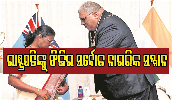 ସୁବା, ୭।୮: ରାଷ୍ଟ୍ରପତି ଦ୍ରୋପଦୀ ମୁର୍ମୁ ଫିଜିର ସର୍ବୋଚ୍ଚ ନାଗରିକ ସମ୍ମାନ ‘କମ୍ପାନିଅନ୍ ଅଫ୍ ଦି ଅର୍ଡର ଅଫ୍ ଫିଜି’ରେ ସମ୍ମାନିତ ହୋଇଛନ୍ତି। ଫିଜି ରାଷ୍ଟ୍ରପତି ରାତୁ ୟୁଲିୟମ ମେବ୍ଲିଲି କଟୋନିବେରେ ମଙ୍ଗଳବାର ଭାରତର ରାଷ୍ଟ୍ରପତିଙ୍କୁ ଏହି ସମ୍ମାନ ପ୍ରଦାନ କରିଛନ୍ତି। ଭାରତ ଓ ଫିଜି ମଧ୍ୟରେ ରହିଥିବା ନିବିଡ଼ ବନ୍ଧୁତାକୁ ଏହି ସମ୍ମାନ ପ୍ରତିଫଳିତ କରୁଛି ବୋଲି ରାଷ୍ଟ୍ରପତି ମୁର୍ମୁ କହିଛନ୍ତି। ସେ ମଙ୍ଗଳବାର ଫିଜି ସଂସଦକୁ ମଧ୍ୟ ସମ୍ବୋଧିତ କରିଛନ୍ତି। ଏହାସହ ରାଷ୍ଟ୍ରପତି ମୁର୍ମୁ ଫିଜି ପ୍ରଧାନମନ୍ତ୍ରୀ ସିଟିବେନୋ ରାବୁକାଙ୍କ ସହ ଦ୍ୱିପାକ୍ଷିକ ଆଲୋଚନା କରିଛନ୍ତି। ଫିଜି ରାଜଧାନୀ ସୁବାରେ ସେ ଭାରତୀୟ ସମୁଦାୟର ଲୋକଙ୍କ ସହ ମଧ୍ୟ ଆଲୋଚନା କରିଛନ୍ତି।