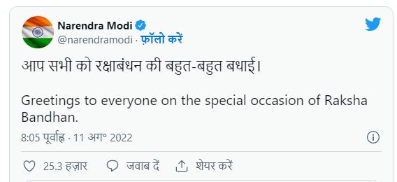 ପ୍ରଧାନମନ୍ତ୍ରୀ ନରେନ୍ଦ୍ର ମୋଦି ମଧ୍ୟ ରକ୍ଷାବନ୍ଧନ ଅବସରରେ ଦେଶବାସୀଙ୍କୁ ଅଭିନନ୍ଦନ ବାର୍ତ୍ତା ଦେଇଛନ୍ତି। ଏହି ଅବସରରେ ଦେଶବାସୀଙ୍କୁ ଅଭିନନ୍ଦନ ଜଣାଇ ପ୍ରଧାନମନ୍ତ୍ରୀ ସୋସିଆଲ ମିଡିଆରେ ଲେଖିଛନ୍ତି, ରକ୍ଷାବନ୍ଧନରେ ଆପଣ ସମସ୍ତଙ୍କୁ ଅନେକ ଅନେକ ଅନେକ ଅଭିନନ୍ଦନ।