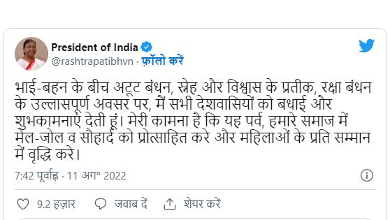 ମୁଁ ଚାହେଁ ଯେ ଏହି ପର୍ବ ଆମ ସମାଜରେ ସୌହାର୍ଦ୍ଦ୍ୟ ବୃଦ୍ଧି କରୁ। ଏହି ପର୍ବ ସମାଜରେ ମହିଳାମାନଙ୍କ ପ୍ରତି ସମ୍ମାନ ବୃଦ୍ଧି କରାଉ ବୋଲି ରାଷ୍ଟ୍ରପତି କହିଛନ୍ତି।