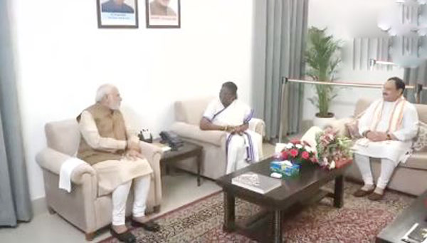 ନୂଆଦିଲ୍ଲୀ,୨୧।୭: ପ୍ରଥମ ଓଡ଼ିଆ ଓ ଆଦିବାସୀ ମହିଳା ଦ୍ରୌପଦୀ ମୁର୍ମୁ ଗୁରୁବାର ଦେଶର ୧୫ତମ ରାଷ୍ଟ୍ରପତି ଭାବେ ନିର୍ବାଚିତ ହୋଇଛନ୍ତି। ମୁର୍ମୁଙ୍କ ଐତିହାସିକ ବିଜୟ ପରେ ଦେଶରେ ଉତ୍ସବର ମାହୋଲ ଦେଖାଦେଇଛି। ଇତିମଧ୍ୟରେ ପ୍ରଧାନମନ୍ତ୍ରୀ ନରେନ୍ଦ୍ର ମୋଦି ଦ୍ରୌପଦୀଙ୍କୁ ଶୁଭେଚ୍ଛା ଜଣାଇବା ପାଇଁ ଦିଲ୍ଲୀ ସ୍ଥିତ ତାଙ୍କ ବାସଭବନରେ ପହଞ୍ଚିଛନ୍ତି। ପୁଷ୍ପଗୁଚ୍ଛ ଦେଇ ମୋଦି ଦ୍ରୌପଦୀଙ୍କୁ ଶୁଭେଚ୍ଛା ଜଣାଇଛନ୍ତି। ଏହି ସମୟରେ ମୋଦିଙ୍କ ସହିତ ଭାଜପା ରାଷ୍ଟ୍ରୀୟ ଅଧ୍ୟକ୍ଷ ଜେ.ପି ନଡ୍ଡା ମଧ୍ୟ ଉପସ୍ଥିତ ରହିଥିଲେ। ନଡ୍ଡା ମଧ୍ୟ ମୁର୍ମୁଙ୍କୁ ତାଙ୍କର ଐତିହାସିକ ବିଜୟ ପାଇଁ ଶୁଭେଚ୍ଛା ଜଣାଇଛନ୍ତି। ଦ୍ରୌପଦୀଙ୍କ ଘରେ ପୂର୍ବରୁ ହିଁ ଉତ୍ସବର ମାହୋଲ ରହିଛି। ସେଠାରେ ମଞ୍ଚ ତିଆରି ହୋଇଥିବା ବେଳେ ରେଡ୍ କାର୍ପେଟ ବିଛାଯାଇଛି।