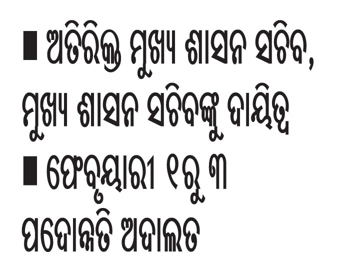 ୨୦୨୨ ଡିସେମ୍ବର ୩୧ ସୁଦ୍ଧା ଯେଉଁ ସରକାରୀ କର୍ମଚାରୀମାନେ ପଦୋନ୍ନତି ପାଇନାହାନ୍ତି ସେସବୁ ପଦୋନ୍ନତି ପ୍ରସଙ୍ଗ ପଦୋନ୍ନତି ଅଦାଲରେ ବିଚାରକୁ ନିଆଯିବ। ଇମେଲ୍ ଜରିଆରେ ସମୁଦାୟ ୧୩୨୬ଟି ଆବେଦନପତ୍ର ଗ୍ରହଣ କରାଯାଇଛି ା ତନ୍ମଧ୍ୟରୁ gadmin.or@nic.inରେ ମିଳିଥିବା ୬୭୧ ଆବେଦନପତ୍ର ଓ ପଦୋନ୍ନତି ଅଦାଲତ ପୋର୍ଟାଲ http://promotion.hrmsodisha.gov.in ଜରିଆରେ ମିଳିଥିବା ୬୫୫ଟି ଆବେଦନକୁ ପଦୋନ୍ନତି ଅଦାଲତରେ ଉପସ୍ଥାପନ କରାଯିବ ା ଇମେଲ୍ ବା ପଦୋନ୍ନତି ଅଦାଲତ ପୋର୍ଟାଲରେ ଉପଲବ୍ଧ ପ୍ରାପ୍ତି ସ୍ବୀକାରର ଗୋଟିଏ ଫଟୋକପି ଆଣିବାକୁ ସମ୍ପୃକ୍ତ ଆବେଦନକାରୀମାନଙ୍କୁ ପରାମର୍ଶ ଦିଆଯାଇଛି। ପଦୋନ୍ନତି ଅଦାଲତ ଅନୁଷ୍ଠିତ ହେଉଥିବା ସ୍ଥାନଗୁଡ଼ିକୁ କେବଳ ଆବେଦନକାରୀ ପ୍ରବେଶ କରିପାରିବେ। ପଦୋନ୍ନତି ଅଦାଲତଗୁଡ଼ିକର ବିସ୍ତୃତ କାର୍ଯ୍ୟସୂଚୀ ସାଧାରଣ ପ୍ରଶାସନ ଓ ପେନ୍ସନ ଅଭିଯୋଗ ବିଭାଗର ୱେବ୍ସାଇଟ୍ରୁ ମିଳିପାରିବ। ପଦୋନ୍ନତି ଅଦାଲତ ପରିଚାଳନା ଦାୟିତ୍ୱ ବିଭିନ୍ନ ଅଧିକାରୀଙ୍କୁ ଦିଆଯାଇଛି। ମୁଖ୍ୟମନ୍ତ୍ରୀଙ୍କ ଅଭିଯୋଗ ପ୍ରକୋଷ୍ଠଠାରେ ଫେବୃୟାରୀ ୧ ସକାଳ ୧୦ଟାରେ ରାଜସ୍ବ ଓ ବିପର୍ଯ୍ୟୟ ପରିଚାଳନା ବିଭାଗ, ଅପରାହ୍ନ ୩ଟାରେ ଯୋଜନା ଓ ସଂଯୋଜନ ବିଭାଗ, ଫେବୃୟାରୀ ୨ ସକାଳ ୧୦ଟାରେ ଗ୍ରାମ୍ୟ ଉନ୍ନୟନ ବିଭାଗ, ଅପରାହ୍ନ ୩ଟାରେ ଇସ୍ପାତ ଓ ଖଣି ବିଭାଗ, ଫେବୃୟାରୀ ୩ ତାରିଖ ସକାଳ ୧୦ଟାରେ ଜଙ୍ଗଲ ଓ ପରିବେଶ ବିଭାଗର ଆବେଦନଗୁଡ଼ିକର ବିଚାର କରାଯିବ। ମୁଖ୍ୟ ଶାସନ ସଚିବ ସୁରେଶ ଚନ୍ଦ୍ର ମହାପାତ୍ରଙ୍କୁ ଏହି ଦାୟିତ୍ୱ ଦିଆଯାଇଛି ା ସେହିପରି ମୁଖ୍ୟମନ୍ତ୍ରୀଙ୍କ ଅଭିଯୋଗ ପ୍ରକୋଷ୍ଠଠାରେ ଫେବୃୟାରୀ ୧ ସକାଳ ୧୦ଟାରେ ଉଚ୍ଚଶିକ୍ଷା ବିଭାଗ, ଅପରାହ୍ନ ୩ଟାରେ ବିଜ୍ଞାନ ଓ ବୈଷୟିକ ବିଭାଗ, ଫେବୃୟାରୀ ୨ ସକାଳ ୧୦ଟାରେ ବିଦ୍ୟାଳୟ ଓ ଗଣଶିକ୍ଷା ବିଭାଗ, ୩ଟାରେ ସାଧାରଣ ଉଦ୍ୟୋଗ ବିଭାଗ, ଫେବୃୟାରୀ ୩ ତାରିଖ ସକାଳ ୧୦ଟାରେ କ୍ରୀଡ଼ା ଓ ଯୁବସେବା ବିଭାଗ, ଅପରାହ୍ନ ୩ ଘଟିକାରେ ସାମାଜିକ ସୁରକ୍ଷା ଓ ଭିନ୍ନକ୍ଷମ ସଶକ୍ତୀକରଣ ବିଭାଗରୁ ମିଳିଥିବା ଆବେଦନଗୁଡ଼ିକୁ ବିଚାର କରାଯିବ। ଅତିରିକ୍ତ ମୁଖ୍ୟ ଶାସନ ସଚିବ ନିକୁଞ୍ଜ କିଶୋର ସୁନ୍ଦରରାୟଙ୍କ ଅଦାଲତରେ ଉକ୍ତ ବିଭାଗଗୁଡିକର ବିଚାର ହେବ ା