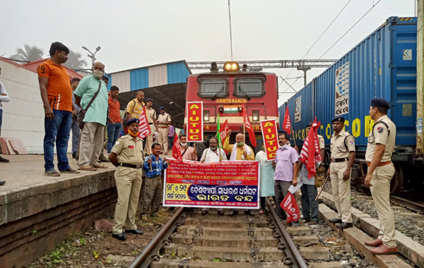 ବାଲେଶ୍ୱର ଅଫିସ ୨୮।୩: କେନ୍ଦ୍ର ସରକାରଙ୍କ ଜନମାରଣ ନୀତି ପ୍ରତିବାଦରେ କେନ୍ଦ୍ରୀୟ ଟ୍ରେଡ୍ ୟୁନିୟନ ପକ୍ଷରୁ ଦୁଇ ଦିନିଆ ଭାରତ ବନ୍ଦ ଡାକରା ଦିଆଯାଇଛି। ଏହି ପରିପ୍ରେକ୍ଷୀରେ ବାଲେଶ୍ବର ରେଳଷ୍ଟଶନରେ ଏଆଇୟୁଟିୟୁସି ପକ୍ଷରୁ ସରକାରଙ୍କ ବିରୋଧରେ ପ୍ରତିବାଦ କରି ଆନ୍ଦୋଳନ କରିଥିଲେ। ଏଆଇୟୁଟିୟୁସି କର୍ମକର୍ତ୍ତା ଷ୍ଟେଶନରେ ଦୀର୍ଘ ସମୟ ଧରି ବିଭିନ୍ନ ଟ୍ରେନକୁ ଅଟକାଇ ଥିଲେ। ବିଶେଷ କରି ଚେନ୍ନାଇ-ହାଓ୍ବଡା ଏକ୍ସପ୍ରେସ, ଭଦ୍ରକ-ହାଓ୍ବଡ଼ା ପେସେଞ୍ଜର ଟ୍ରେନ, ଏବଂ ବାଙ୍ଗିରୀପୋଷି-ଭୁବନେଶ୍ବର ଏକ୍ସପ୍ରେସ ଟ୍ରେନକୁ ଆନ୍ଦୋଳନକାରୀମାନେ ଅଟକାଇ ଥିଲେ। ଏପରିକି ଆନ୍ଦୋଳନକାରୀମାନେ ବାଲେଶ୍ୱର ସହରରେ ପିକେଟିଂ କରି ବିଭିନ୍ନ ସରକାରୀ କାର୍ଯ୍ୟାଳୟ ବନ୍ଦ କରିଥିଲେ।