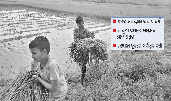 ୧୩ ତାରିଖ ଶନିବାର ଭାପୁର ବ୍ଲକରେ ୪୫.୧ ମିମି, ଦଶପଲ୍ଲା ବ୍ଲକରେ ୪୫.୮ ମିମି, ଗଣିଆରେ ୪୬ ମିମି, ଖଣ୍ଡପଡା ବ୍ଲକରେ ୯୧.୪ ମିମି, ନୟାଗଡ଼ ବ୍ଲକରେ ୮୫.୦ ମିମି, ନୂଆଗଁା ବ୍ଲକରେ ୬୫.୦ ମିମି, ଓଡ଼ଗଁା ବ୍ଲକରେ ୬୬.୪ ମିମି, ରଣପୁର ବ୍ଲକରେ ୫୩.୪ ମିିମି ବର୍ଷା ହୋଇଛି । ସେହିପରି ଶୁକ୍ରବାର ଭାପୁର ବ୍ଲକରେ ୩.୨ ମିମି, ନୟାଗଡ଼ ବ୍ଲକରେ ୨.୦ମିମି, ରଣପୁର ବ୍ଲକରେ ୧୦.୨ ମିମି ଅନୁରୂପ ଭାବେ ବର୍ଷା ହୋଇଛି । ଏନେଇ ନୟାଗଡ଼ ବ୍ଲକ ଗମ୍ଭାଡି ସାମନ୍ତରାପୁର ଗଁାର ଚାଷୀ ବିଜୟ ବେହେରା କୁହନ୍ତି, ମୁଁ ୩ ମାଣ ଜମିରେ ଧାନ ଫସଲ କରିଥିଲି। ବର୍ଷା ଆସିବା ପୂର୍ବରୁ ଅଢ଼େଇ ମାଣ ଜମିରୁ ଧାନ କାଟି ଦେଇଥିଲି । ବର୍ଷା ପରେ ଜମିରେ କଟା ଯାଇଥିବା ଧାନ ଭାସୁଛି । ଏଭଳିସ୍ଥଳେ କଟା ଯାଇଥିବା ଧାନକୁ ବର୍ଷାରେ ଭିଜି ପରିବାର ଲୋକେ ଏକାଠି ହୋଇ ରାସ୍ତା ଉପରକୁ ଆଣିଛୁ । ଖରା ହେଲେ ଏହାକୁ ଶୁଖାଯିବ । ଖରା ନ ହେଲେ ଆହୁରି ଅଧିକ କ୍ଷତି ହେବ। କୁମ୍ଭାରିଆ ଗଁାର ପୂର୍ଣ୍ଣଚନ୍ଦ୍ର ମହାପାତ୍ର କୁହନ୍ତି, ମୁଁ ୮ମାଣ ଜମିରେ ଫସଲ କରିଥିଲି । ମୋର ଭଲ ଧାନ ହୋଇଥିଲା। ବର୍ଷା ପୂର୍ବରୁ ୬ମାଣ ଜମିର ଫସଲ କାଟି ଦେଇଥିଲି । ବର୍ଷା ଯୋଗୁ କଟା ଧାନ ଜମିରେ ଭାସୁଛି । ମୁଁ ଏକୁଟିଆ ଲୋକ, ପାଣିରେ ଭାସୁଥିବା ଧାନକୁ ମଧ୍ୟ ସଂଗ୍ରହ କରି ପାରୁ ନାହିଁ କହି ସେ ଦୁଃଖ ପ୍ରକାଶ କରିଥିଲେ । ଲୋକ ଲଗାଇ ବୋହିବା ସମ୍ଭବ ହେଉ ନାହିଁ। ବର୍ଷା ସମୟରେ ଶ୍ରମିକ ମିଳୁ ନାହାନ୍ତି ବୋଲି କହିଛନ୍ତି । କେନ୍ଦୁଢ଼ିପିର ଯୋଗେନ୍ଦ୍ର ନାୟକ କୁହନ୍ତି, ମୋର ୪ ମାଣ ଧାନ ପାଣିରେ ବୁଡି ରହିଛି। ପ୍ରାୟ ୨ମାଣ ଜମିର ଧାନ କାଦୁଅରେ ରହିଛି । ଏ ବର୍ଷ ପାଣି ଓ କାଦୁଅରୁ ଧାନ ସଂଗ୍ରହ କରିବାକୁ ପଡିବ । ଅମଳ କମିବା ସହ ଧାନର ମାନ କମିଯିବ ବୋଲି ସେ କହିଛନ୍ତି । ଗଣିଆର ସୁଦାମ ପ୍ରଧାନ, ନୂଆଗଁାର ହୀନ ନାୟକ, ଦଶପଲ୍ଲାର କୁଞ୍ଜ ବେହେରା, ଫତେଗଡ଼ର ରାମଚନ୍ଦ୍ର ସ୍ବାଇଁ କୁହନ୍ତି, ଧାନ ଅମଳ ସମୟରେ ବର୍ଷା ଧାନ ଫସଲକୁ ନଷ୍ଟ କରିବ । ବେଶି କ୍ଷତି ଖାଲୁଆ ଜମିରେ ହେବ । ଉଚ୍ଚା ଜମିରେ ପାଣି ଗଡ଼ି ଯାଇଛି। ଏବେ ବର୍ଷାରେ ଚାଷୀ ବିଲକୁ ଯାଇ ହୁଡା ହାଣି ଜଳ ନିଷ୍କାସନ କରିବାରେ ଲାଗି ପଡିଛି । ତେବେ ଧାନ ଫସଲ ଭଲ ହେବ ବୋଲି ଯାହା କୁହାଯାଉଥିଲା ଏହି ଲଗାଣ ବର୍ଷା ସେହି ଆଶାକୁ ଧୂଳିସାତ୍ କରିଛି ବୋଲି ଚାଷୀମାନେ କହିଛନ୍ତି ।