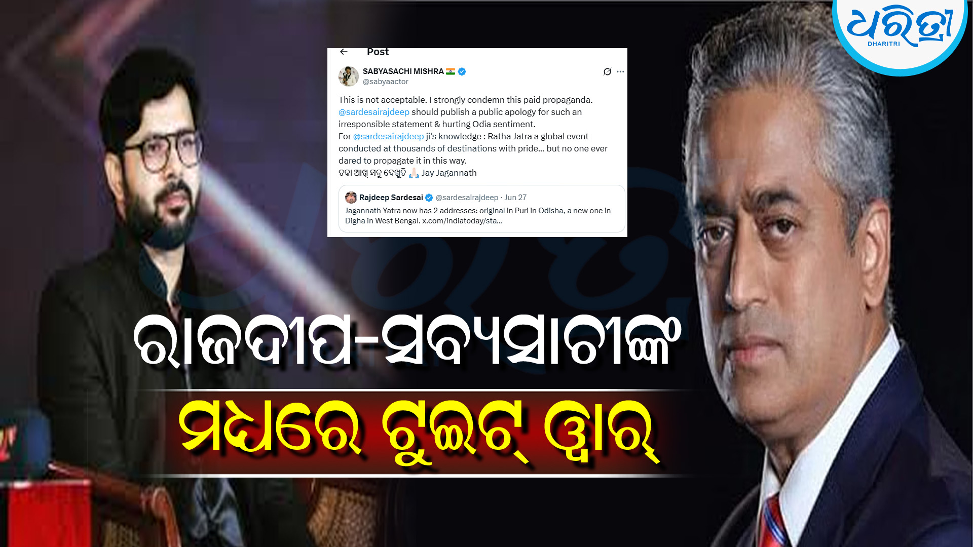 ଭୁବନେଶ୍ୱର, ୨୮ା୬ (ବନ୍ଦନା ସେଠୀ) – ମହାପ୍ରଭୁ ଶ୍ରୀଜଗନ୍ନାଥଙ୍କ ରଥଯାତ୍ରାକୁ ନେଇ ଶ୍ରୀକ୍ଷେତ୍ର ସମେତ ସାରା ରାଜ୍ୟ ଚଳଚଞ୍ଚଳ ହୋଇପଡିଛି। ରଥାରୁଢ ଦିଅଁଙ୍କୁ ଦର୍ଶନ କରିବା ପାଇଁ ଦେଶ ବିଦେଶରୁ ଶ୍ରଦ୍ଧାଳୁମାନେ ପୁରୀରେ ଡେରା ପକାଇଛନ୍ତି। ଏଭଳି ସମୟରେ ବିଶ୍ୱ ପ୍ରସିଦ୍ଧ ପୁରୀ ରଥଯାତ୍ରା ସହିତ ପଶ୍ଚିମବଙ୍ଗ ଦୀଘା ଜଗନ୍ନାଥ ମନ୍ଦିର ରଥଯାତ୍ରାକୁ ତୁଳନା କରି ଅଡୁଆରେ ପଡିଛନ୍ତି ବରିଷ୍ଠ ସାମ୍ବାଦିକ ରାଜଦୀପ ସର୍ଦେଶାଇ। ଅଭିନେତା ସବ୍ୟସାଚୀ ମିଶ୍ର ରାଜଦୀପଙ୍କ ଏଭଳି ପୋଷ୍ଟକୁ ନିନ୍ଦା କରିବା ସହିତ ଏହା କୋଟି କୋଟି ଓଡ଼ିଆଙ୍କ ଭାବାବେଗକୁ ଆଘାତ ଦେଇଥିବାରୁ ଏଥିପାଇଁ ସେ କ୍ଷମା ପ୍ରାର୍ଥନା କରିବା ଉଚିତ ବୋଲି ଦାବି କରିଥିଲେ। କିଛି ସମୟ ପାଇଁ ଉଭୟଙ୍କ ମଧ୍ୟରେ ଟୁଇଟ୍ ଓ୍ବାର୍ ମଧ୍ୟ ଦେଖିବାକୁ ମିଳିଥିଲା। ତେବେ ସବ୍ୟସାଚୀଙ୍କ ସମର୍ଥନରେ ଅନେକ ଶ୍ରଦ୍ଧାଳୁ ବାହାରିବା ପରେ ଶେଷରେ ରାଜଦୀପ ଏନେଇ କ୍ଷମା ପ୍ରାର୍ଥନା କରିଛନ୍ତି।