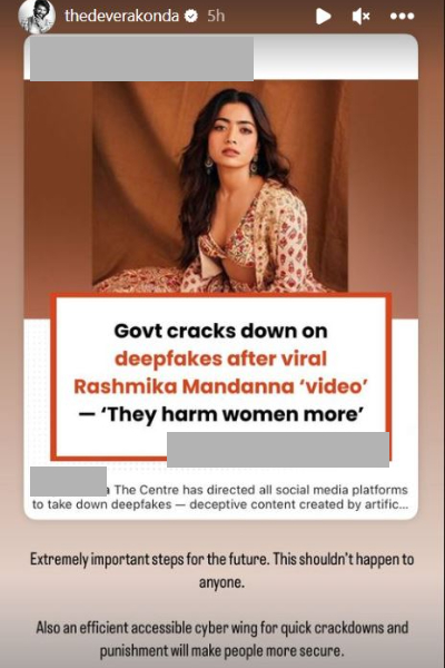ବିଜୟ କଥିତ ପ୍ରେମିକା ରଶ୍ମିକାଙ୍କ ସମର୍ଥନରେ ବାହାରି ନିଜ ଇନ୍ଷ୍ଟାଗ୍ରାମରେ ଏକ ପୋଷ୍ଟ ଶେୟାର କରିଛନ୍ତି। ଏପରି କରିଥିବା ବ୍ୟକ୍ତିଙ୍କ ପାଇଁ ବିରୋଧରେ କାର୍ଯ୍ୟାନୁଷ୍ଠାନ ଦାବି କରିଛନ୍ତି କି ଯାହା ଦ୍ୱାରା ମହିଳାମାନେ ନିଜକୁ ନିରାପଦ ଅନୁଭବ କରିପାରିବେ।