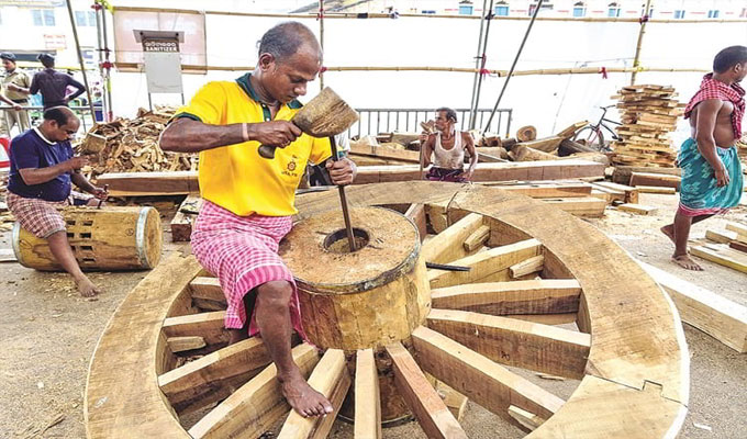 ପୁରୀ ଅଫିସ,୨୯।୫: ପୁରୀ ରଥଯାତ୍ରା ପାଇଁ ରଥଖଳା ପାଇଁ ଚଳଚଞ୍ଚଳ ହୋଇ ଉଠିଛି। ରଥ ଖଳାରେ ତିନି ରଥ ନିର୍ମାଣ କାର୍ଯ୍ୟ ଜୋରଦାର ଆଗେଇ ଚାଲିଛି । ରଥ ଖଳାରେ ଚଉଦନାହାକା କାମ ଆରମ୍ଭ ହୋଇଯାଇଛି । ବିଶ୍ୱକର୍ମାମାନେ ବାରିସିରେ ହାଣି ଏହି ଚଉଦଟି କାଠକୁ ପ୍ରସ୍ତୁତ କରୁଛନ୍ତି । ଦଣ୍ଡା ଉପରେ ଖଦିଓରା ପଡ଼ି , ଚଉଦନାହାକାର ସାଲ ସବୁକୁ ଖଦିଓରାର ବିନ୍ଧରେ ସ୍ଥାପନ କରାଯିବ । ଚାରିନାହାକା ଓ ଛଅ କାଠକୁ ଦୃଷ୍ଟିଦେଇ ଚଉଦନାହାକା ବୁଲିବ । ରଥରେ ଚଉଦନାହାକା ବୁଲିଲେ ପ୍ରଥମ ଭୂଇଁ ଟୁଙ୍ଗୁରା ହେବ ।