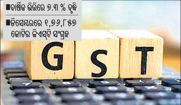 ସେହିଭଳି ଚଳିତ ଆର୍ଥିକ ବର୍ଷର ଡିସେମ୍ବରରେ ମୋଟ ୧,୭୬,୮୫୭ କୋଟି ଟଙ୍କା ଜିଏସ୍ଟି ଆକାରରେ ସଂଗ୍ରହ କରାଯାଇଛି। ସେଥିମଧ୍ୟରୁ କେନ୍ଦ୍ରୀୟ ଟିକସ (ସିଜିଏସ୍ଟି) ବାବଦରେ ୩୨,୮୩୬କୋଟି ଟଙ୍କା ଆଦାୟ ହୋଇଥିବାବେଳେ ରାଜ୍ୟ ଟିକସ (ଏସ୍ଜିଏସ୍ଟି) ବାବଦକୁ ୪୦,୪୯୯ କୋଟି ଆଦାୟ ହୋଇଛି। ସେହିପରି ଇଣ୍ଟ୍ରିଗ୍ରେଟେଡ୍ ଜିଏସ୍ଟି (ଆଇଜିଏସ୍ଟି) ବାବଦକୁ ମୋଟ ୯୧,୨୨୧ କୋଟି ଟଙ୍କା ଏବଂ ସେସ୍ ବାବଦରେ ୧୨,୩୦୧ କୋଟି ଟଙ୍କା ଟିକସ ଆକାରରେ ସଂଗ୍ରହ କରାଯାଇଛି।