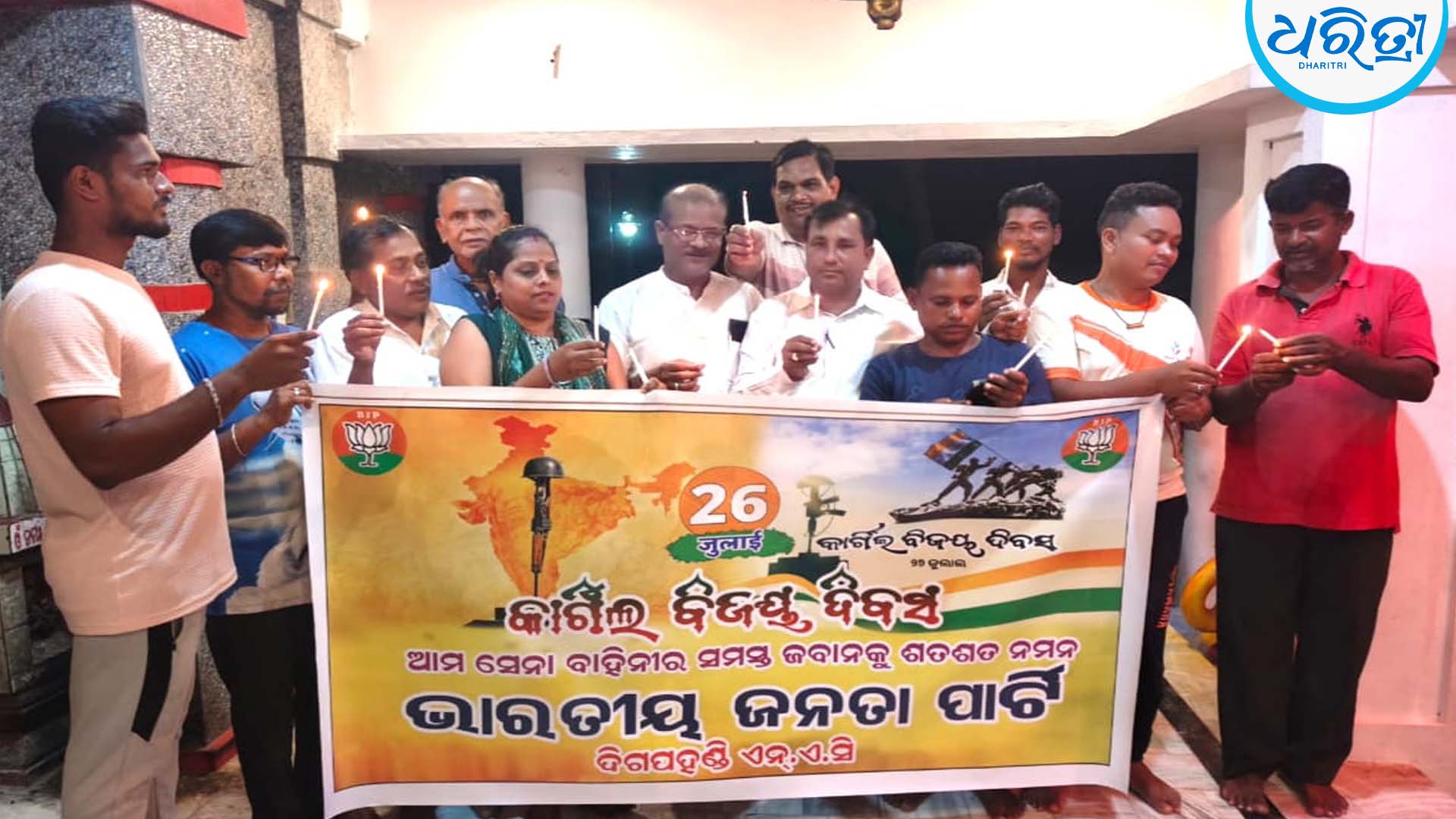 ଦିଗପହଣ୍ଡି,୨୬ା୭(ଅଶେଷ ନାଥ ମିଶ୍ର): ଗଞ୍ଜାମ ଜିଲା ଦିଗପହଣ୍ଡିଠାରେ ଶନିବାର ସନ୍ଧ୍ୟାରେ ଭାଜପା ପକ୍ଷରୁ କାର୍ଗିଲ ବିଜୟ ଦିବସ ପାଳିତ ହୋଇଯାଇଛି। ସ୍ଥାନୀୟ ଶ୍ରୀଚନ୍ଦ୍ର ଚୂଡ଼େଶ୍ୱର ଶୈବପୀଠ ପ୍ରାଙ୍ଗଣରେ ଆୟୋଜିତ କାର୍ଯ୍ୟକ୍ରମରେ ଭାଜପା ଶକ୍ତିକେନ୍ଦ୍ର କାର୍ଯ୍ୟକର୍ତ୍ତା ସୁଷମା ଗୌଡ଼ ଅଧ୍ୟକ୍ଷତା କରିଥିଲେ। କାର୍ଗିଲ ଯୁଦ୍ଧରେ ଦେଶ ମାତୃକାର ସେବାରେ ନିୟୋଜିତ ଥିବା ସେନାବାହିନୀର ବହୁ ସଂଖ୍ୟକ ଯବାନ ଶହୀଦ ହୋଇଥିଲେ। ଦିବଂଗତ ଯବାନମାନଙ୍କ ସ୍ମୃତିରେ କ୍ୟାଣ୍ଡେଲ ପ୍ରଜ୍ଜ୍ୱଳନ କରାଯାଇଥିଲା।