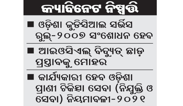 ଏଥିସହିତ ଜିଲା ବିଚାରପତି ଏବଂ ସିଭିଲ ଜଜ୍ କ୍ୟାଡରରେ ନ୍ୟାୟିକ ଅଧିକାରୀଙ୍କ ଆଇନଗତ ଓ ପ୍ରଶାସନିକ କ୍ଷମତାକୁ ସୁଦୃଢ଼ କରିବା ପାଇଁ ଓଡ଼ିଶା ସୁପର ଜୁଡିସିଆଲ ସର୍ଭିସ ଏବଂ ଓଡ଼ିଶା ଜୁଡିସିଆଲ ସର୍ଭିସ ରୁଲ୍-୨୦୦୭କୁ ସଂଶୋଧନ କରାଯିବ। ଆଇନ ବିଭାଗ ପକ୍ଷରୁ ଦିଆଯାଇଥିବା ଏହି ପ୍ରସ୍ତାବକୁ ରାଜ୍ୟ କ୍ୟାବିନେଟରେ ଅନୁମୋଦନ କରାଯାଇଛି। ପ୍ରାଣୀ ଚିକିତ୍ସା ସେବା ବର୍ଗରେ ମୂଳ ପଦବୀରେ ନିଯୁକ୍ତି କରାଯିବା ସହିତ ପଦୋନ୍ନତିଭିତ୍ତିକ ପଦବୀ ସୃଷ୍ଟି କରିବା ଏବଂ ରାଜ୍ୟ ସରକାରଙ୍କ ବିଭିନ୍ନ କଲ୍ୟାଣକାରୀ ଯୋଜନା ଓ କାର୍ଯ୍ୟକ୍ରମର ସଫଳ ରୂପାୟନ କରିବା ଲକ୍ଷ୍ୟରେ ରାଜ୍ୟ ସରକାର ଓଡ଼ିଶା ପ୍ରାଣୀ ଚିକିତ୍ସା ସେବା (ନିଯୁକ୍ତି ଓ ସେବା) ନିୟମାବଳୀ ୨୦୨୧ କାର୍ଯ୍ୟକାରୀ କରିବାକୁ ଯାଉଛନ୍ତି। ମତ୍ସ୍ୟ ଓ ପ୍ରାଣୀ ସମ୍ପଦ ବିଭାଗ ପକ୍ଷରୁ ଦିଆଯାଇଥିବା ଏହି ପ୍ରସ୍ତାବକୁ କ୍ୟାବିନେଟ ମୋହର ମାରିଛି।