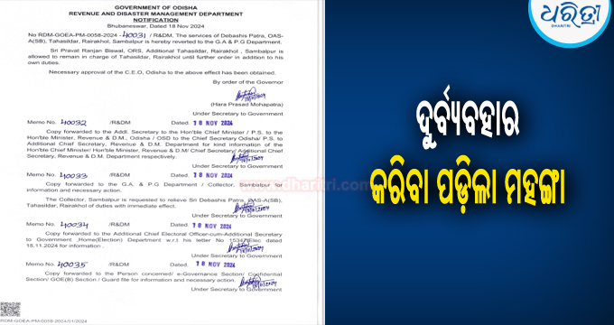 ରାଜସ୍ବ ଓ ପରିଚାଳନା ବିଭାଗର ପତ୍ର ସଂଖ୍ୟା-୪୦୦୩୧, ତାରିଖ ୧୮/୧୧/୨୦୨୪ରେ ପ୍ରକାଶିତ ବିଜ୍ଞପ୍ତି ଅନୁଯାୟୀ ତହସିଲଦାର ଦେବାଶିଷ ପାତ୍ରଙ୍କୁ ସାଧାରଣ ପ୍ରଶାସନ ବିଭାଗ ଭୁବନେଶ୍ବରକୁ ବଦଳି କରାଯାଇଥିବା ବେଳେ ରେଢାଖୋଲ ଅତିରିକ୍ତ ତହସିଲଦାର ପ୍ରଭାତ ରଞ୍ଜନ ବିଶ୍ବାଳଙ୍କୁ ପରବର୍ତ୍ତି ନିର୍ଦ୍ଦେଶ ପର୍ଯ୍ୟନ୍ତ ତହସିଲଦାର ଦାୟିତ୍ୱରେ ରହିବାକୁ କୁହାଯାଇଛି।