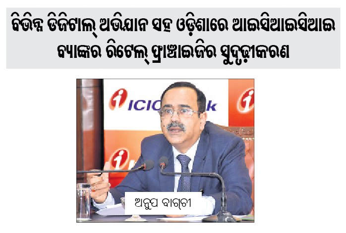 ଏ ସମ୍ପର୍କରେ ଆଇସିଆଇସିଆଇ ବ୍ୟାଙ୍କର କାର୍ଯ୍ୟନିର୍ବାହୀ ନିର୍ଦ୍ଦେଶକ (ଇଡି) ଅନୁପ ବାଗ୍ଚୀ ଏକ ଖବରଦାତା ସମ୍ମିଳନୀ ଜରିଆରେ କହିଛନ୍ତି, ଆମ ପାଇଁ ଓଡ଼ିଶା ହେଉଛି ଏକ ଗୁରୁତ୍ୱପୂର୍ଣ୍ଣ ବଜାର। ନିକଟରେ ଥିବା ୪ଟି ରାଜ୍ୟରେ ଆମର ରିଟେଲ ବ୍ୟାଙ୍କିଙ୍ଗ୍ ପରିଚାଳନା ପାଇଁ ଭୁବନେଶ୍ୱରକୁ ମୁଖ୍ୟାଳୟ କରାଯାଇଛି। ଓଡ଼ିଶାରେ ବିଭିନ୍ନ ପ୍ରକାର ଡିଜିଟାଲ ଅଭିଯାନ ଜରିଆରେ ଆମେ ଆମର ଫ୍ରାଞ୍ଚାଇଜି, ଡେଲିଭରି ଓ ସେବା ପ୍ରଦାନ ଦକ୍ଷତାକୁ ସୁଦୃଢ଼ କରିବାକୁ ପ୍ରୟାସ ଜାରି ରଖିଛୁ। ସେହିଭଳି ଚଳିତ ଆର୍ଥିକ ବର୍ଷରେ ରାଜ୍ୟରେ ଦ୍ରୁତ ଗତିରେ ଏହାର ଖୁଚରା ଋଣ ବ୍ୟବସାୟକୁ ବିସ୍ତାର କରିବା ଲାଗି ବ୍ୟାଙ୍କ ଏହାର ପ୍ରଯୁକ୍ତି ଶକ୍ତିକୁ ବ୍ୟବହାର କରୁଛି। ବନ୍ଧକ ଋଣ ଆବଣ୍ଟନ ରାଜ୍ୟରେ ୩୦% ବୃଦ୍ଧି ପାଇ ୧,୨୫୦ କୋଟି ଟଙ୍କାକୁ ବୃଦ୍ଧି ପାଇବ ବୋଲି ବ୍ୟାଙ୍କ ପକ୍ଷରୁ ଆଶା କରାଯାଉଥିବା ବେଳେ ମୁଖ୍ୟତଃ ବ୍ୟକ୍ତିଗତ ଋଣ ଓ ଯାନ ଋଣକୁ ନେଇ ଗଠିତ ଉପଭୋକ୍ତା ଋଣ ୪୦%ରୁ ଅଧିକ ବୃଦ୍ଧି ପାଇ ୧୮୦୦ କୋଟି ଟଙ୍କାର ହେବ ବୋଲି ଆଶା କରାଯାଉଛି। ବ୍ୟାଙ୍କ ଏହାର ବ୍ୟବସାୟ ଋଣ ଓ ଓଭରଡ୍ରାଫ୍ଟ ଆବଣ୍ଟନକୁ ୩୫% ବଢ଼ାଇ ୧୩୦୦ କୋଟିରୁ ଊର୍ଦ୍ଧ୍ୱ କାରବାର କରିବାକୁ ଲକ୍ଷ୍ୟ ରଖିଛି।