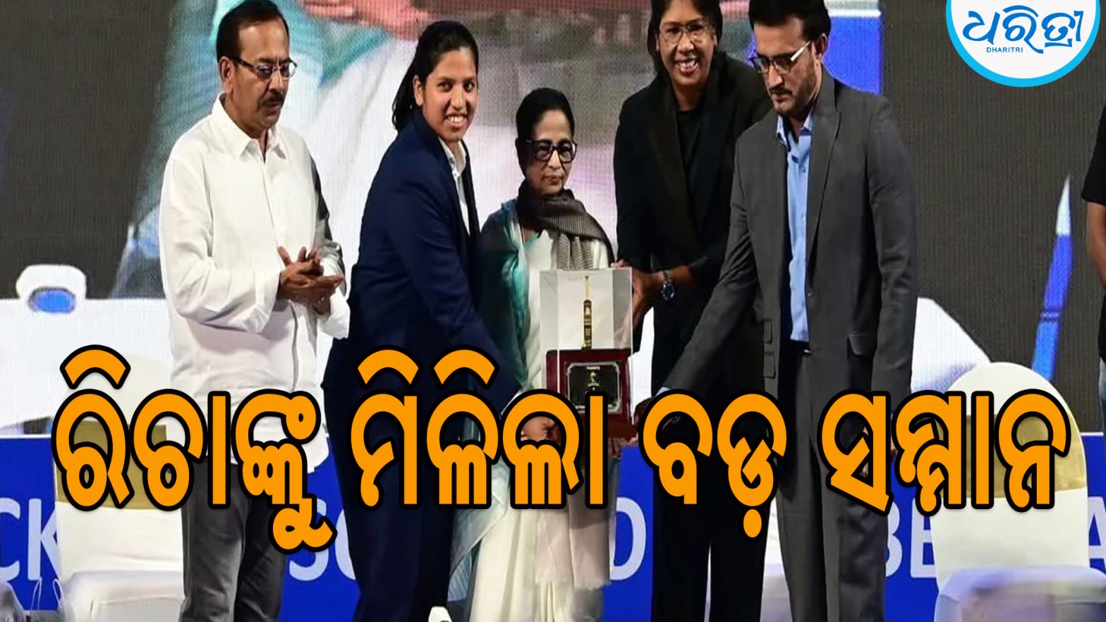 କୋଲ୍କାତା,୮ା୧୧- ବିଶ୍ୱକପ୍ ବିଜୟୀ ଭାରତୀୟ ମହିଳା ଦଳର ଉଇକେଟ୍କିପର ବ୍ୟାଟର ରିଚା ଘୋଷ୍ଙ୍କୁ ଶନିବାର ଇଡେନ୍ ଗାର୍ଡେନ୍ସଠାରେ ଆୟୋଜିତ ଏକ ସମାରୋହରେ ସମ୍ବର୍ଦ୍ଧିତ କରାଯାଇଛି। ତାଙ୍କୁ ପଶ୍ଚିମବଙ୍ଗ ସରକାରଙ୍କ ପକ୍ଷରୁ ରାଜ୍ୟର ସବୁଠୁ ବଡ଼ ସମ୍ମାନ ବଙ୍ଗ ଭୂଷଣ ପୁରସ୍କାର ଦିଆଯିବା ସହ ଡେପୁଟି ସୁପରିଣ୍ଟେଣ୍ଡେଣ୍ଟ ଅଫ୍ ପୋଲିସ(ଡିଏସ୍ପି) ଭାବେ ନିଯୁକ୍ତ କରାଯାଇଛି।ଏଥିସହ ତାଙ୍କୁ ଏକ ସୁନାହାର ମଧ୍ୟ ଦିଆଯାଇଛି।
