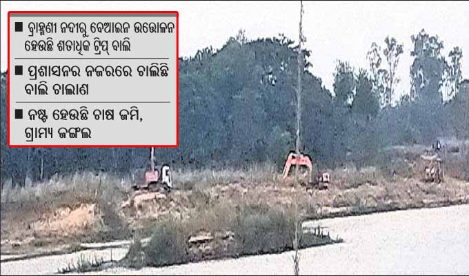 ସୂଚନା ଅଧିକାର କର୍ମୀ ନରେନ୍ଦ୍ର ଧଳ, ପେଣ୍ଠପାଳ ସମିତିସଭ୍ୟ ଶଶାଙ୍କ ଶେଖର ବିଶ୍ୱାଳ, ତରଡ଼ିପାଳ ସମିତି ସଭ୍ୟ ନିରଞ୍ଜନ ବାରକ, ଅଳପୁଆ ସମିତି ସଭ୍ୟ ରାମଚନ୍ଦ୍ର ସେଠୀ, ସିହଂଗଁା ସମିତି ସଭ୍ୟ ଅଭୟ ସ୍ବାଇଁ, ଅର୍ଜୁନୀ ବିଶ୍ୱାଳ ପ୍ରମୁଖ କହିଛନ୍ତି, ପଟ୍ଟାମୁଣ୍ଡାଇ ବ୍ଲକରେ ସରକାରଙ୍କ ପକ୍ଷରୁ ୪ଟି ବାଲି ସଇରାତ ନିଲାମ ଦିଆଯାଇଛି ବୋଲି ତହସିଲଦାର ସୂଚନା ଦେଇଛନ୍ତି। ମାତ୍ର ଏହି ୪ଟି ସଇରାତ ବ୍ୟତୀତ ବ୍ରାହ୍ମଣୀ ନଦୀର ବିଭିନ୍ନ ସ୍ଥାନରୁ ବେଆଇନ ଭାବେ ବାଲି ଉତ୍ତୋଳନ କରାଯାଉଛି। ପ୍ରତ୍ୟହ ଶତାଧିକ ଟ୍ରାକ୍ଟର ଯୋଗେ ଏସବୁ ବାଲି ଚାଲାଣ କରାଯାଉଥିବା ଅଭିଯୋଗ ହେଉଛି। ଏ ନେଇ ଧୋୟାଞ୍ଚଳବାସୀ ବାରମ୍ବାର ତହସିଲଦାରଙ୍କୁ ଅବଗତ କରିଥିଲେ ମଧ୍ୟ କୌଣସି ପଦକ୍ଷେପ ଗ୍ରହଣ କରାଯାଉନାହିଁ। ଅତୀତରେ ଲୋକଦେଖାଣିଆ ଭାବେ କେତେବେଳେ କେମିତି ଚଢ଼ାଉ କରାଯାଉଥିବା ବେଳେ ଏବେ ଚଢାଉ ହେଉ ନ ଥିବାରୁ ବାଲି ମାଫିଆମାନେ ଦିନରାତି ବାଲି ବୋହି ଚାଲିଛନ୍ତି। ଫଳରେ ସରକାରଙ୍କ ବିପୁଳ ରାଜସ୍ବହାନି ହେଉଥିବାବେଳେ ନଦୀବନ୍ଧ ପ୍ରତି ବିପଦ ସୃଷ୍ଟି ହେଉଛି। ବ୍ଲକର ଅଳପୁଆ, ନାହିଆଡିଆ, ଅମୃତମଣୋହି, ତରଡିପାଳ ସଇରାତ ନିଲାମ ଦିଆଯାଇଛି ବୋଲି ତହସିଲଦାର ସୂଚନା ଦେଇଥିବା ବେଳେ ତମାଳଶାସନ ଗ୍ରାମ ନିକଟସ୍ଥ ନଦୀ ପଠାରୁ ଓ ନୀଳକଣ୍ଠପୁର ସଇରାତରୁ ପ୍ରତ୍ୟହ ଟ୍ରାକ୍ଟର ଯୋଗେ ବାଲି ବେଆଇନ ଭାବେ ଚାଲାଣ ହେଉଛି। ବାଲି ଚୋରାଚାଲାଣକାରୀମାନେ ଦିନରାତି ଏଠାରୁ ବାଲି ଉତ୍ତୋଳନ କରୁଛନ୍ତି। ବିଭିନ୍ନ ସ୍ଥାନରେ ଠିକାଦାର କରୁଥିବା ରାସ୍ତା ଓ ଘର କାମରେ ଏସବୁ ବାଲି ବ୍ୟବହାର କରାଯାଉଛି। ବାଲି ଚାଲାଣ ସମୟରେ ରାଜସ୍ବ ବିଭାଗ ପକ୍ଷରୁ ଚଢ଼ାଉ କରାଯାଉନାହଁି। ବେଆଇନ ଭାବେ ବାଲି ଚାଲାଣ ଯୋଗୁ ନଦୀପଠା ଖୋଳି ହୋଇ ବନ୍ଧ ପ୍ରତି ବିପଦ ସୃଷ୍ଟି କରୁଛି। ଏଥିସହ ନଦୀପଠାରେ ଥିବା ଚାଷ ଜମି ଓ ସୃଷ୍ଟି ହୋଇଥିବା ଗ୍ରାମ୍ୟ ଜଙ୍ଗଲ ନଷ୍ଟ ହେଉଛି। ଏଭଳି ବାଲି ଉତ୍ତୋଳନ ଯୋଗୁ ଆଗକୁ ବନ୍ୟାପାଣି ଆସିଲେ ତାହା ସିଧାସଳଖ ନଦୀବନ୍ଧରେ ପିଟି ହେବାର ଆଶଙ୍କା ରହିଛି ବୋଲି ସେମାନେ କହିଛନ୍ତି। ସେହିପରି ଏହି ବାଲି ବିନା ଟ୍ରାନଜିଟ୍ ପରମିଟ୍ରେ ନିକଟସ୍ଥ ଯାଜପୁର ଜିଲାକୁ ଚାଲାଣ ହେଉଛି। ଏହା ଉପରେ ରାଜସ୍ବ ବିଭାଗ କୌଣସି ପଦକ୍ଷେପ ଗ୍ରହଣ କରୁ ନ ଥିବା ଅଭିଯୋଗ ହେଉଛି। ତେଣୁ ଏ ନେଇ ଆବଶ୍ୟକ ପଦକ୍ଷେପ ଗ୍ରହଣ କରିବାକୁ ସ୍ଥାନୀୟ ଲୋକେ ଦାବି କରିଛନ୍ତି। ଏ ସମ୍ପର୍କରେ ପଟ୍ଟାମୁଣ୍ଡାଇ ତହସିଲଦାର ପଞ୍ଚାନନ ନାୟକଙ୍କୁ ପଚାରିବାରୁ ବେଆଇନ ବାଲି ଚାଲାଣ ରୋକିବାକୁ ଆଗାମୀଦିନରେ ଚଢ଼ାଉ ଜାରି ରହିବ ବୋଲି ସେ କହିଛନ୍ତି।