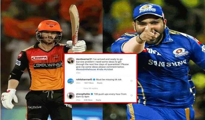 ନୂଆଦିଲ୍ଲୀ,୩।୪: ଏପ୍ରିଲ ୯ରୁ ଆରମ୍ଭ ହେବାକୁ ଯାଉଛି ଇଣ୍ଡିଆନ୍ ପ୍ରିମିୟର ଲିଗ୍(ଆଇପିଏଲ୍)-୨୦୨୧। ଏହାପୂର୍ବରୁ ଖେଳାଳିମାନେ ନିଜ ନିଜ ଫ୍ରାଞ୍ଚାଇଜ ସହ ଯୋଡ଼ି ହେଉଛନ୍ତି। ସନରାଇଜର୍ସ ହାଇଦ୍ରାବାଦର ଅଧିନାୟକ ଡେଭିଡ୍ ଓ୍ବାର୍ନର ଶନିବାର ନିଜ ହୋଟେଲ ରୁମ୍ରେ ଏକ ଭିଡିଓ କରି ସୋସିଆଲ ମିଡିଆରେ ପୋଷ୍ଟ କରିଥିଲେ। ସେଥିରେ ସେ କ୍ୱାରାଣ୍ଟାଇନ୍ରେ ରହିବା ସମୟରେ ସମୟ ବିତାଇବା ଲାଗି କ’ଣ କରିବା ଉଚିତ ବୋଲି ପ୍ରଶଂସକଙ୍କୁ ପଚାରିଥିଲେ। ଏହାକୁ ନେଇ ମୁମ୍ବାଇ ଇଣ୍ଡିଆନ୍ସ ଅଧିନାୟକ ରୋହିତ ଶର୍ମା ଓ୍ବାର୍ନରଙ୍କୁ ଟ୍ରୋଲ କରିଛନ୍ତି। ଟିକ୍ଟକ୍ କରିପାରୁ ନ ଥିବାକୁ ନେଇ ଦୁଃଖ ଲାଗୁଥିବ ନିଶ୍ଚୟ ବୋଲି ହିଟ୍ମ୍ୟାନ୍ କହିଛନ୍ତି। ଏଭଳି ମଜାଦାର କମେଣ୍ଟକୁ ବେଶ ପସନ୍ଦ କରାଯାଉଛି।