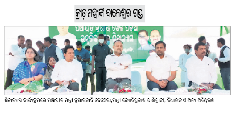 ବାଲେଶ୍ୱର ଅଫିସ/ରେମୁଣା, ୧୯।୧୨(ଡି.ଏନ.ଏ.): ବାଲେଶ୍ୱର ଜିଲାକୁ ରାଜ୍ୟ କ୍ରୀଡ଼ା ଓ ଯୁବସେବା, ଇଲେକଟ୍ରୋନିକ୍ସ ଓ ସୂଚନା ପ୍ରଯୁକ୍ତି ମନ୍ତ୍ରୀ ତୁଷାରକାନ୍ତି ବେହେରା ଶନିବାର ଦିନିକିଆ ଗସ୍ତରେ ଆସି ବିଭିନ୍ନ ପ୍ରକଳ୍ପ ଶିଳାନ୍ୟାସ ଓ ଉଦ୍ଘାଟନ କରିଛନ୍ତି। ରେମୁଣା ବ୍ଲକ ବରୁଣସିଂ ଗ୍ରାମପଞ୍ଚାୟତର ରୁପାବାଲି ପଞ୍ଚାୟତସ୍ତରୀୟ ଖେଳପଡ଼ିଆ ଉନ୍ନତିକରଣର ଶିଳାନ୍ୟାସ କରିଛନ୍ତି।