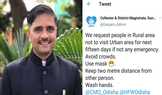 ଛତ୍ରପୁର,୨୭।୬(ଡି.ଏନ୍.ଏ.): ଗଞ୍ଜାମ ଜିଲାରେ ଦ୍ରୁତ ଗତିରେ କରୋନା ଆକ୍ରାନ୍ତଙ୍କ ସଂଖ୍ୟା ବଢ଼ିବାରେ ଲାଗିଛି। ଏ ନେଇ ଜିଲାରେ ଗ୍ରାମାଞ୍ଚଳ ଲୋକଙ୍କୁ ଆସନ୍ତା ୧୫ ଦିନ ପାଇଁ ସହରକୁ ଆସିବାକୁ ବାରଣ କରାଯାଇଛି। ଶନିବାର ଏ ସମ୍ପର୍କରେ ଗଞ୍ଜାମ ଜିଲାପାଳ ବିଜୟ ଅମୃତା କୁଲାଙ୍ଗେ ଟୁଇଟ କରି ସୂଚନା ଦେଇଛନ୍ତି। କୌଣସି ଜରୁରୀ କାମ ନ ଥିଲେ ସହରକୁ ନ ଆସିବାକୁ ଜିଲାପାଳ ଗ୍ରାମାଞ୍ଚଳ ଲୋକଙ୍କୁ ଅନୁରୋଧ କରିଛନ୍ତି। ମାସ୍କ ପରିଧାନ, ସାମାଜିକ ଦୂରତ୍ୱ ରକ୍ଷା କରିବା ସହ ହାତକୁ ଭଲଭାବେ ଧୋଇବା ପାଇଁ ମଧ୍ୟ କହିଛନ୍ତି ।