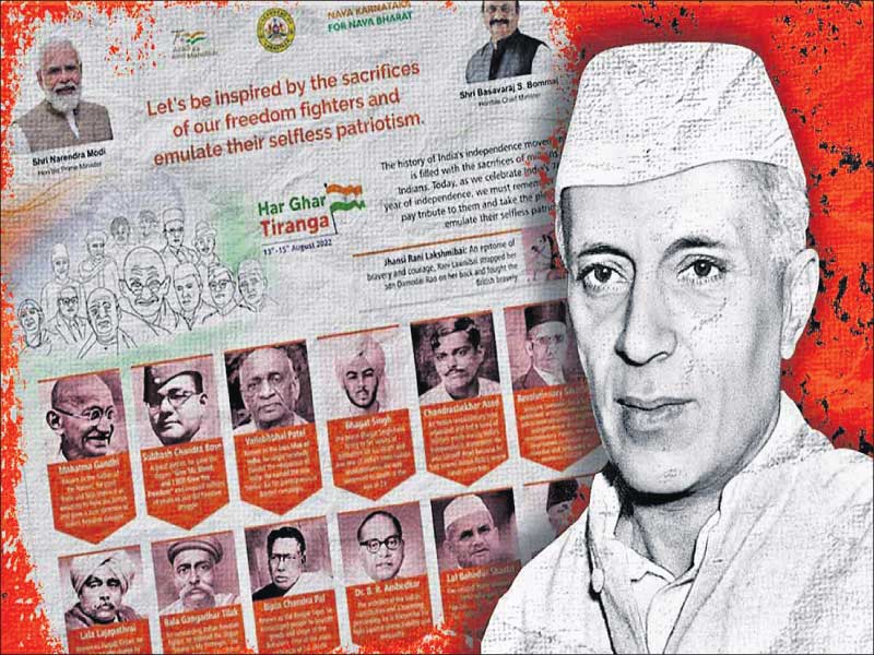 ନରେନ୍ଦ୍ର ମୋଦିଙ୍କ ଆହ୍ବାନ କ୍ରମେ କର୍ନାଟକରେ ‘ହର୍ ଘର ତ୍ରିରଙ୍ଗା’ ଅଭିଯାନ ଚାଲିଛି। ଏହି ଅବସରରେ ମୁଖ୍ୟମନ୍ତ୍ରୀ ବାସବରାଜ ବୋମାଇଙ୍କ ନେତୃତ୍ୱାଧୀନ ସରକାରଙ୍କ ପକ୍ଷରୁ ସ୍ବାଧୀନତା ସଂଗ୍ରାମୀମାନଙ୍କୁ ଶ୍ରଦ୍ଧାଞ୍ଜଳି ଦେବା ଉଦ୍ଦେଶ୍ୟରେ ରବିବାର ଖବରକାଗଜଗୁଡ଼ିକରେ ଏକ ଫୁଲ୍ ପେଜ୍ ବିଜ୍ଞାପନ ପ୍ରକାଶ କରାଯାଇଛି। ଉକ୍ତ ବିଜ୍ଞାପନରେ ନେହେରୁଙ୍କୁ ବାଦ୍ ଦେଇ ରାଷ୍ଟ୍ରୀୟ ସ୍ବୟଂସେବକ ସଂଘ (ଆର୍ଏସ୍ଏସ୍) ବିଚାରକ ବୀର ସାବରକରଙ୍କୁ ସ୍ଥାନ ଦିଆଯାଇଥିବାରୁ କଂଗ୍ରେସ ସମାଲୋଚନା କରିଛି।