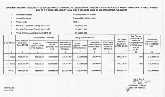 କେନ୍ଦୁଝର,୩୧।୧(ସ୍ବ.ପ୍ର.) : ବେଆଇନ ଖଣି ଖନନ ପାଇଁ ସାରଦା ମାଇନ୍ସ ପ୍ରାଇଭେଟ ଲିମିଟେଡ ଉପରେ ୨ ହଜାର ୫୬ କୋଟି ୩୮ ଲକ୍ଷ ୪୩ ହଜାର ଟଙ୍କାର ଜରିମାନା କରାଯାଇଥିବା ଯୋଡ଼ା ସ୍ଥିତ ଖଣି ଯୁଗ୍ମ ନିର୍ଦ୍ଦେଶକ ସଲିଲ ବେହେରା କହିଛନ୍ତି। ବିନା ପରିବେଶୀୟ ଆନୁମତିରେ ଧାର୍ଯ୍ୟଠାରୁ ବହୁ ଅଧିକ ଖଣି ଖନନ କରାଯାଇଥିବା ଜଣାପଡ଼ିବା ପରେ ଆଗରୁ ଦୁଇ ଥର କାରଣ ଦର୍ଶାଅ ନୋଟିସ କରାଯାଇଥିଲା। ସନ୍ତୋଷଜନକ ଉତ୍ତର ନ ମିଳିବାରୁ ଜରିମାନା କରାଯାଇଥିବା ଜଣାପଡ଼ିଛି। ଏନେଇ ଗତ ୨୫ ତାରିଖରେ କେନ୍ଦୁଝର ଜିଲା ଯୋଡ଼ା ଖଣି ଯୁଗ୍ମ ନିର୍ଦ୍ଦେଶକଙ୍କ କାର୍ଯ୍ୟାଳୟରୁ ସାରଦା ଖଣିର ନିର୍ଦ୍ଦେଶକ ଅର୍ଜୁନ ସାରସ୍ବତଙ୍କ ନିକଟକୁ ଜରିମାନା ପାଇଁ ଡିମାଣ୍ଡ ନୋଟିସ ପଠାଯାଇଛି। ଏନେଇ ସାରଦା ଖଣିର ନିର୍ଦ୍ଦେଶକଙ୍କୁ ଫୋନ ଯୋଗେ ପଚରା ଯାଇଥିଲେ ହେଁ ବ୍ୟସ୍ତତା ଥିବା ଦର୍ଶାଇ କିଛି କହି ନ ଥିଲେ। ତେବେ ୧୫ ଦିନ ମଧ୍ୟରେ ଏମ୍‌ଏମଡିଆର ଆକ୍ଟ ଅନୁଯାୟୀ କ୍ଷତିପୂରଣ ବାବଦରେ ଉକ୍ତ ଜରିମାନା ପୈଠ କରିବାକୁ ଆଦେଶ ଦିଆଯାଇଛି।