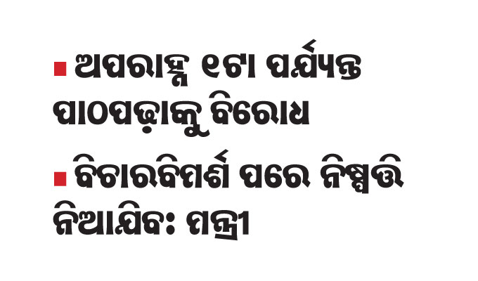 ଭୁବନେଶ୍ୱର,୧।୩(ବ୍ୟୁରୋ): ଗ୍ରୀଷ୍ମ ପ୍ରବାହକୁ ଦୃଷ୍ଟିରେ ରଖି ରାଜ୍ୟରେ ସ୍କୁଲ୍ ଖୋଲିବା ସମୟରେ ପରିବର୍ତ୍ତନ କରାଯାଇଛି। ସୋମବାରଠାରୁ ପରିବର୍ତ୍ତିତ ସମୟ ଅନୁସାରେ ସ୍କୁଲ ଖୋଲିବା ସହ ପାଠପଢ଼ା ଚାଲିବ। ରାଜ୍ୟର ସମସ୍ତ ବିଦ୍ୟାଳୟରେ ନବମ ଓ ଏକାଦଶ ଶ୍ରେଣୀଗୁଡ଼ିକର ପାଠପଢ଼ା ସକାଳ ୮ଟା ୩୦ରୁ ୧୦ଟା ପରିବର୍ତ୍ତେ ସକାଳ ୭ଟାରୁ ୯ଟା ପର୍ଯ୍ୟନ୍ତ ହେବ। ସେହିପରି ଦଶମ ଓ ଦ୍ୱାଦଶ ଶ୍ରେଣୀଗୁଡ଼ିକ ପୂର୍ବାହ୍ନ ୧୧ଟାରୁ ଅପରାହ୍ନ ୪ ବଦଳରେ ସକାଳ ୯ଟାରୁ ଅପରାହ୍ନ ୧ଟା ପର୍ଯ୍ୟନ୍ତ ଚାଲିବ। ବିଦ୍ୟାଳୟ ଓ ଗଣଶିକ୍ଷା ବିଭାଗ ପକ୍ଷରୁ ପୂର୍ବରୁ ଜାରି ହୋଇଥିବା ମାର୍ଗଦର୍ଶିକାକୁ କଡ଼ାକଡ଼ି ପାଳନ କରାଯିବ। ସ୍କୁଲ ସମୟ ନିର୍ଘଣ୍ଟରେ ହୋଇଥିବା ପରିବର୍ତ୍ତନକୁ ବିଭିନ୍ନ ସ୍ତରରୁ ବିରୋଧ କରାଯାଇଛି। ରବିବାର କଂଗ୍ରେସ ବିଧାୟକ ସନ୍ତୋଷ ସିଂ ସାଲୁଜା ଓ ଭାଜପା ବିଧାୟକ ମୋହନ ମାଝୀ ଏ ପ୍ରସଙ୍ଗରେ ମନ୍ତବ୍ୟ ଦେଇ କହିଛନ୍ତି, ସରକାରଙ୍କ ଏଭଳି ନିଷ୍ପତ୍ତି ଛାତ୍ରୀଛାତ୍ରଙ୍କୁ ଅଧିକ କଷ୍ଟ ଦେବ। ବର୍ତ୍ତମାନ ଯେଉଁଭଳି ତାପମାତ୍ରା ରହୁଛି ଅପରାହ୍ନ ୧ଟାରେ ସ୍କୁଲ ଛୁଟି ହେବା ନିଷ୍ପତ୍ତି ଗ୍ରହଣଯୋଗ୍ୟ ନୁହେଁ। ତେଣୁ ଯଥାଶୀଘ୍ର ସରକାର ସେହି ସମୟକୁ ପରିବର୍ତ୍ତନ କରନ୍ତୁ ବୋଲି ସେମାନେ ଦାବି କରିଛନ୍ତି। ସେହିପରି ଶୁକ୍ରବାର ଓଡ଼ିଶା ମାଧ୍ୟମିକ ସ୍କୁଲ ସଂଘ(ଓଷ୍ଟା) ପକ୍ଷରୁ ମଧ୍ୟ ଏହାକୁ ବିରୋଧ କରାଯିବା ସହ ରବିବାର ସ୍କୁଲ ଆସିବେ ନାହିଁ ବୋଲି ସରକାରଙ୍କୁ ଚେତାବନୀ ଦିଆଯାଇଛି। ସ୍କୁଲ ସମୟ ପରିବର୍ତ୍ତନ ନେଇ ବିଚାର ବିମର୍ଶ କରାଯାଇ ନିଷ୍ପତ୍ତି ନିଆଯିବ ବୋଲି ବିଦ୍ୟାଳୟ ଓ ଗଣଶିକ୍ଷା ମନ୍ତ୍ରୀ ସମୀର ରଞ୍ଜନ ଦାସ କହିଛନ୍ତି।